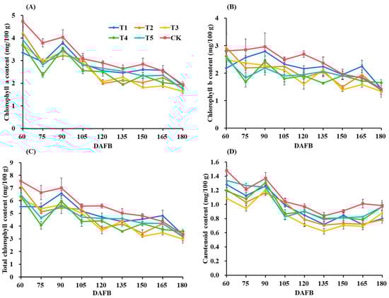 From DAFB60 to DAFB90, the content of chlorophyll a exhibited a trend of initial decline followed by a subsequent increase (Figure 4A). After DAFB90, the values of all treatments decreased gradually, and minimal values were observed during the maturity period. The control maintained a consistently higher chlorophyll a content during development. Chlorophyll b displayed marked fluctuations and a general decreasing trend, reaching minimal values during the maturity period (Figure 4B). While the control showed superior chlorophyll b retention, all treatments except T4 tended to be consistent at maturity. The trend of the total chlorophyll content of all treatments was similar to that of chlorophyll a, demonstrating sustained degradation throughout fruit development (Figure 4C). In general, the control fruits maintained significantly higher chlorophyll concentrations during the active growth phases.