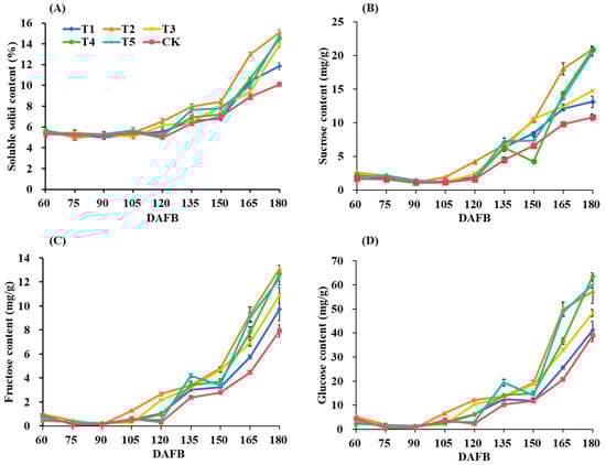The effects of different treatments on the soluble solid (A), sucrose (B), fructose (C), and glucose (D) contents of ‘Zaoxu’ fruit. Each value in the graphs shows the mean of three replicates. T1, T2, and T3 are 500×, 1000×, and 1500× dilutions of organic water-soluble fertilizer. T4 and T5 are 500× and 1000× dilutions of microbial fertilizer. CK: control.