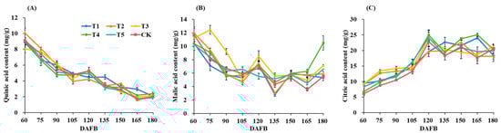 The effects of different treatments on the quinic acid (A), malic acid (B), and citric acid (C) contents of ‘Zaoxu’ fruit. Each value in the graphs shows the mean of three replicates. T1, T2, and T3 are 500×, 1000×, and 1500× dilutions of organic water-soluble fertilizer. T4 and T5 are 500× and 1000× dilutions of microbial fertilizer. CK: control.