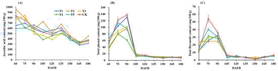 The effects of different treatments on the ascorbic acid (A), total phenol (B), and total flavonoid (C) contents of ‘Zaoxu’ fruit. Each value in the graphs shows the mean of three replicates. T1, T2, and T3 are 500×, 1000×, and 1500× dilutions of organic water-soluble fertilizer. T4 and T5 are 500× and 1000× dilutions of microbial fertilizer. CK: control.