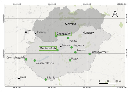 Map of the study sites (green points) located in Hungary and Slovakia in 2019 and/or 2020. The two sites indicated in bold (Martonvásár and Želiezovce) were selected for more detailed analysis (see Table 1 for cultivars planted on each site and Section 2.2.4 for the selected sites analysis).