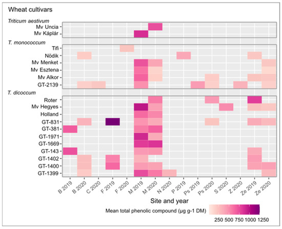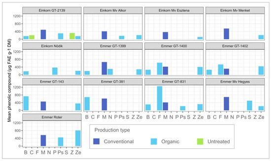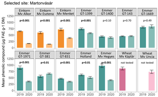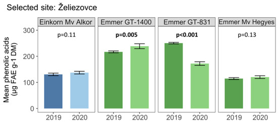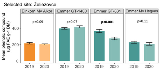 In the Martonvásár test location (which was managed conventionally, but without chemical pesticide treatment), the average values of the two years (2019 and 2020) showed that the highest mean total PC was detected in an emmer cultivar with 826 µg FAE g−1 DM (GT-1669) (Table 2). However, a similarly high value was observed in the control common wheat samples with 869 µg FAE g−1 DM for Mv Káplár and 739 µg FAE g−1 DM for Mv Uncia in 2019 and 2020 (Figure 2).