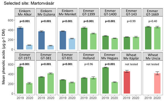 Effect of cropping year on mean ± SD of total phenolic acids in selected wheat cultivars at the site Martonvásár (2019, 2020). Note that the two common wheat varieties were only present in one year (Mv Káplár in 2019 and Mv Uncia in 2020); therefore, they were not tested for year effect but are shown as a comparison. Significant (ANOVA p-value) differences between the two years of measurements are annotated in each cultivar, with significant values appearing in bold.