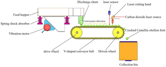 The laser scoring device for Camellia oleifera fruit (Figure 2) is a homemade apparatus that incorporates a vibration feeding device, a conveying device, and a laser scoring device. The vibration feeding device comprises a hopper, a vibration motor, a spring shock absorber, and other components. The conveying device consists of a sprocket, a drive shaft, a “V” conveyor belt, a drive mechanism, and other components. The laser scoring module consists of four core components: the CO2 laser, laser cutting head, electric lifter, and chiller system.