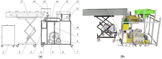 The Camellia oleifera fruit laser scoring device. (a) Structural diagram of Camellia oleifera fruit laser scoring device. 1. Chiller; 2. electric lifter; 3. collection bin; 4. electromagnetic air pump; 5. blower; 6. belt pulley; 7. caster; 8. drive motor; 9. belt tensioner pulley; 10. vibration motor; 11. spring shock absorber; 12. feed hopper; 13. discharge chute; 14. V-shaped conveyor belt; 15. laser cutting head; 16. laser cutting protective cover; and 17. CO2 laser. (b) Physical prototype of Camellia oleifera laser scoring device.
