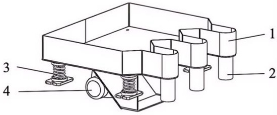 Camellia oleifera fruit vibratory feeder. 1. Feed hopper; 2. discharge chute; 3. spring shock absorber; and 4. vibrating motor.