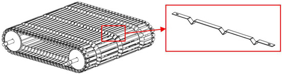 The key to the laser scoring technology for Camellia oleifera fruits lies in achieving the ordered alignment and positioning of fruits with varying sizes and shapes prior to scoring. Based on morphological studies of the fruits, a “V”-shaped positioning and conveying plate was designed, as shown in Figure 4. This system consists of multiple “V”-shaped positioning plates and a conveyor chain. Each plate has openings at both ends and is mounted onto the chain via bolts, forming a complete “V”-shaped positioning and a conveying belt. This ensures that fruits remain centered within the grooves of the “V”-shaped plates during transport. To prevent interference between adjacent plates, the plate width is set to 18 mm. The upper opening of the “V”-shaped groove is 40–45 mm wide, with a 90-degree angle between its walls. Since the safety distance between adjacent lasers must be no less than 150 mm, the spacing between “V”-shaped grooves is set to 160 mm. To withstand the laser’s intensity and prevent the penetration or ablation/melting of the plates, metal materials are used for fabrication.