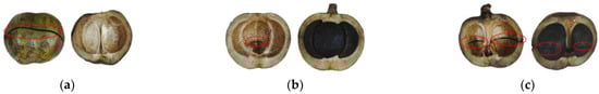 The key criteria for evaluating laser scoring quality are scoring effectiveness (whether the shell is fully penetrated) and seed integrity (the absence of damage to Camellia oleifera seeds). We referred to the definition of notching quality for walnuts in Reference [23] and extended it to define the notching quality criteria for Camellia oleifera fruits. Fruits with non-penetrated shells are classified as scratches; those with fully penetrated shells and intact seeds as valid notches; and those with penetrated shells but damaged seeds as damaged notches. A notch refers to structured incisions (e.g., V/U-shaped) penetrating the shell without kernel damage, formed by laser or mechanical processing; Scratches denote non-penetrative unstructured surface damage (e.g., abrasions). A schematic diagram illustrating these scoring quality categories is presented in Figure 5. The scoring qualification rate (η) is adopted as the evaluation metric, where a higher η value indicates superior scoring quality.