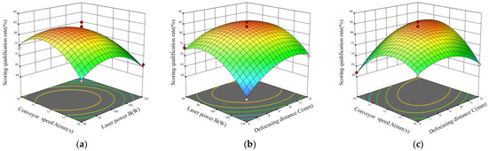 The laser power and defocusing distance in the experiment are described in Figure 7a. Figure 7a illustrates the effects of conveyor speed and laser power on the scoring qualification rate. The elliptical contour lines of factors A (conveyor speed) and B (laser power) indicate a significant interaction effect between them. The elliptical contour lines between these two factors indicate a significant interaction effect. The overall trend indicates that as the conveyor speed and laser power increase, the scoring qualification rate initially increases and subsequently decreases. The influence of conveyor speed is more pronounced than that of laser power. The conveyor speed and defocusing distance are shown in Figure 7b. Figure 7b demonstrates the influence of the laser power and defocusing distance on the scoring qualification rate. Although factors B (laser power) and C (defocusing distance) exhibit elliptical contour lines, their interaction effect is not statistically significant. Conveyor speed and laser power are shown in Figure 7c. Figure 7c shows the impact of the conveyor speed and defocusing distance on the scoring qualification rate. The elliptical contour lines of factors A (conveyor speed) and C (defocusing distance) suggest a significant interaction effect between these two parameters. The overall trend suggests that as both conveyor speed and defocusing distance increase, the scoring qualification rate first increases and then decreases. The effect of conveyor speed is more dominant compared to the defocusing distance.