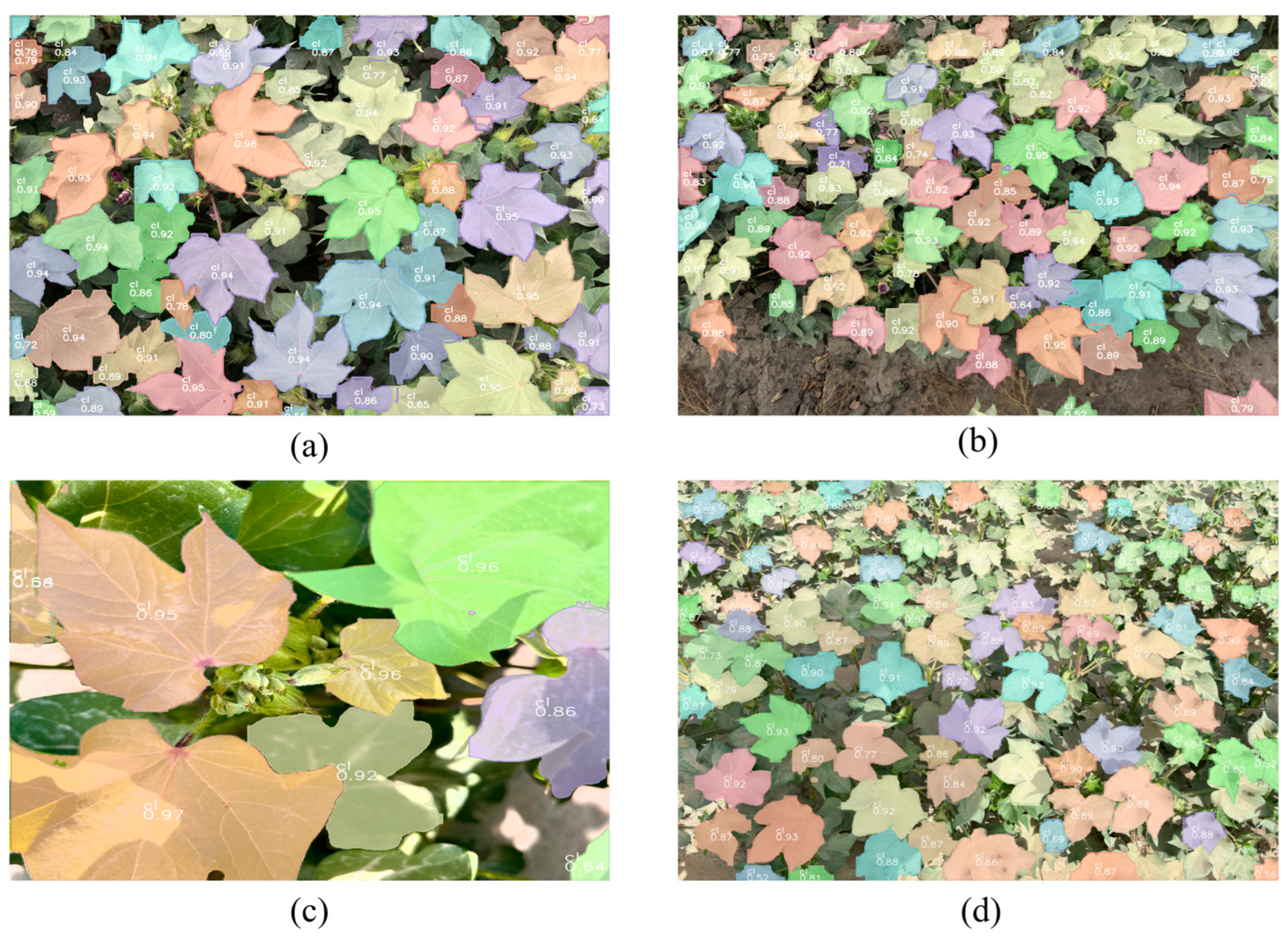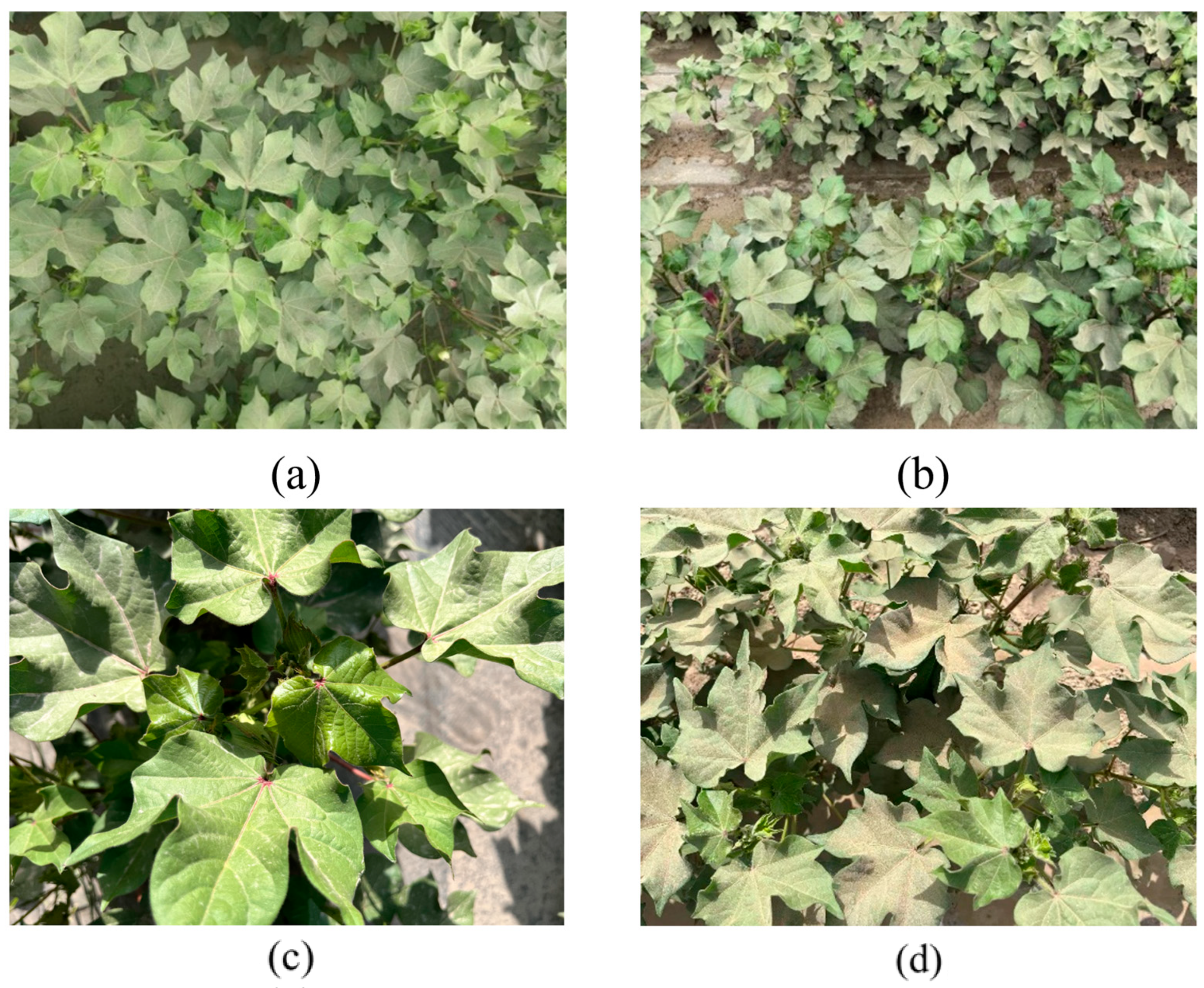 Cotton leaf images under different conditions. (a) Densely occluded leaf, (b) overlapping leaves within the canopy, (c) isolated and unobstructed leaf from a single plant, and (d) leaf with dust deposition.