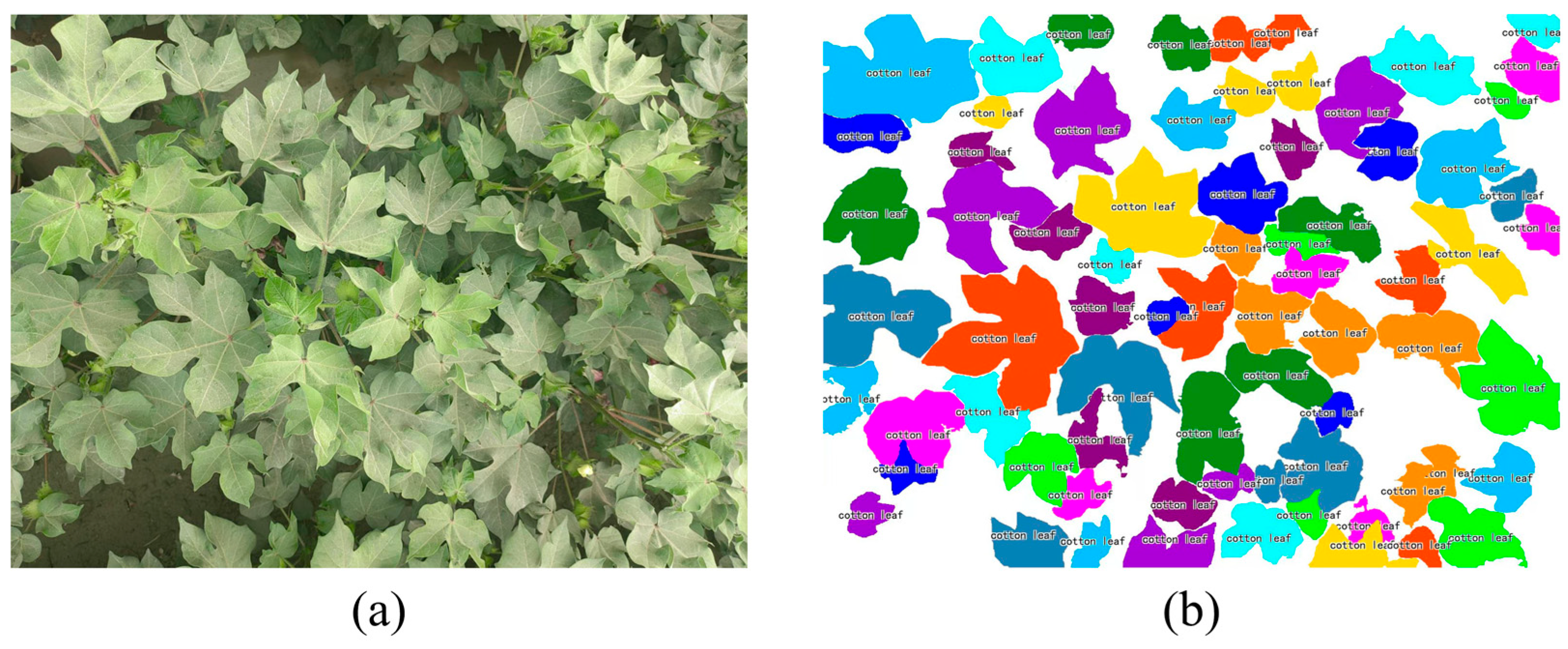 SAM-annotated cotton leaf image. (a) Raw field cotton leaf image; (b) leaf-annotated image with background removed.