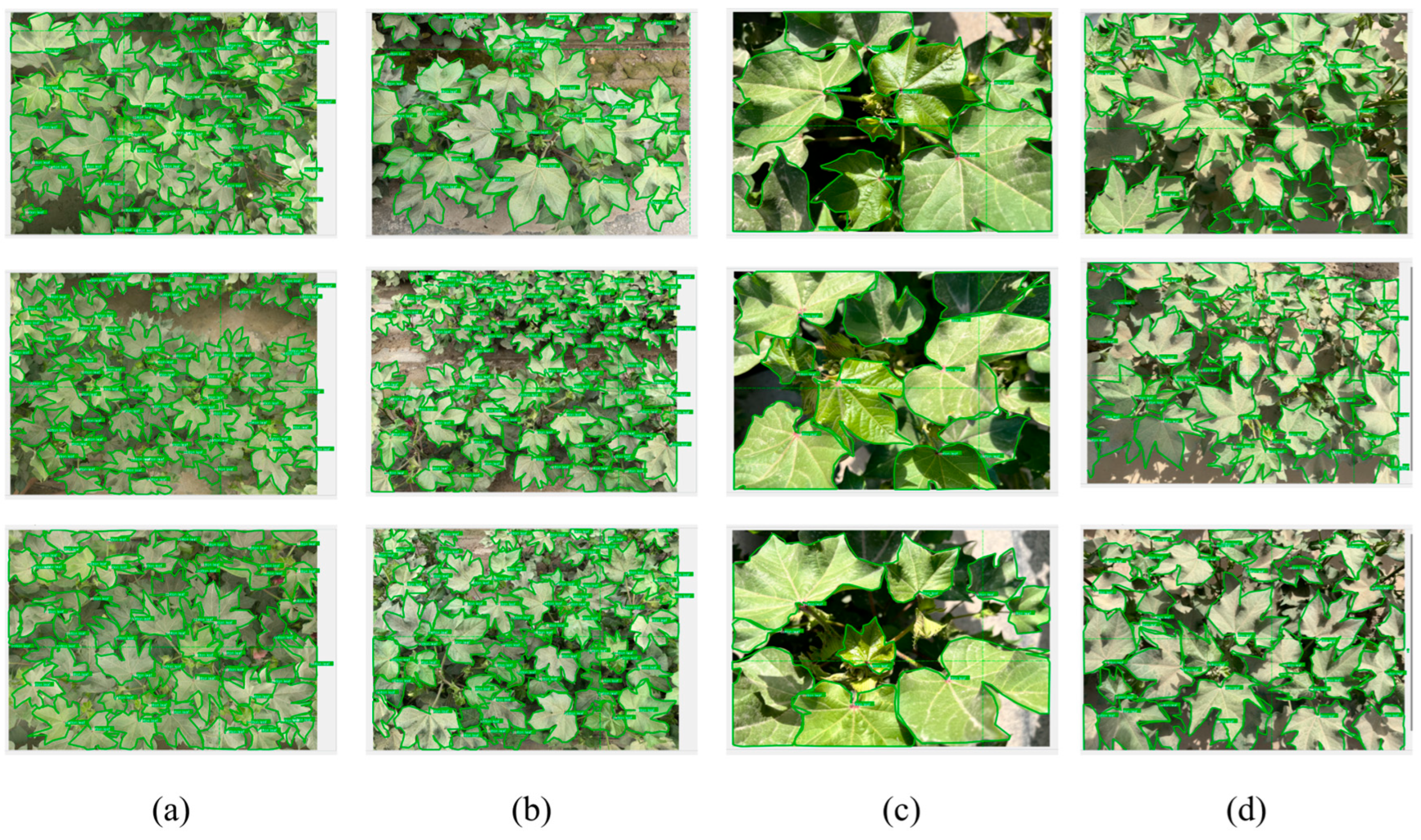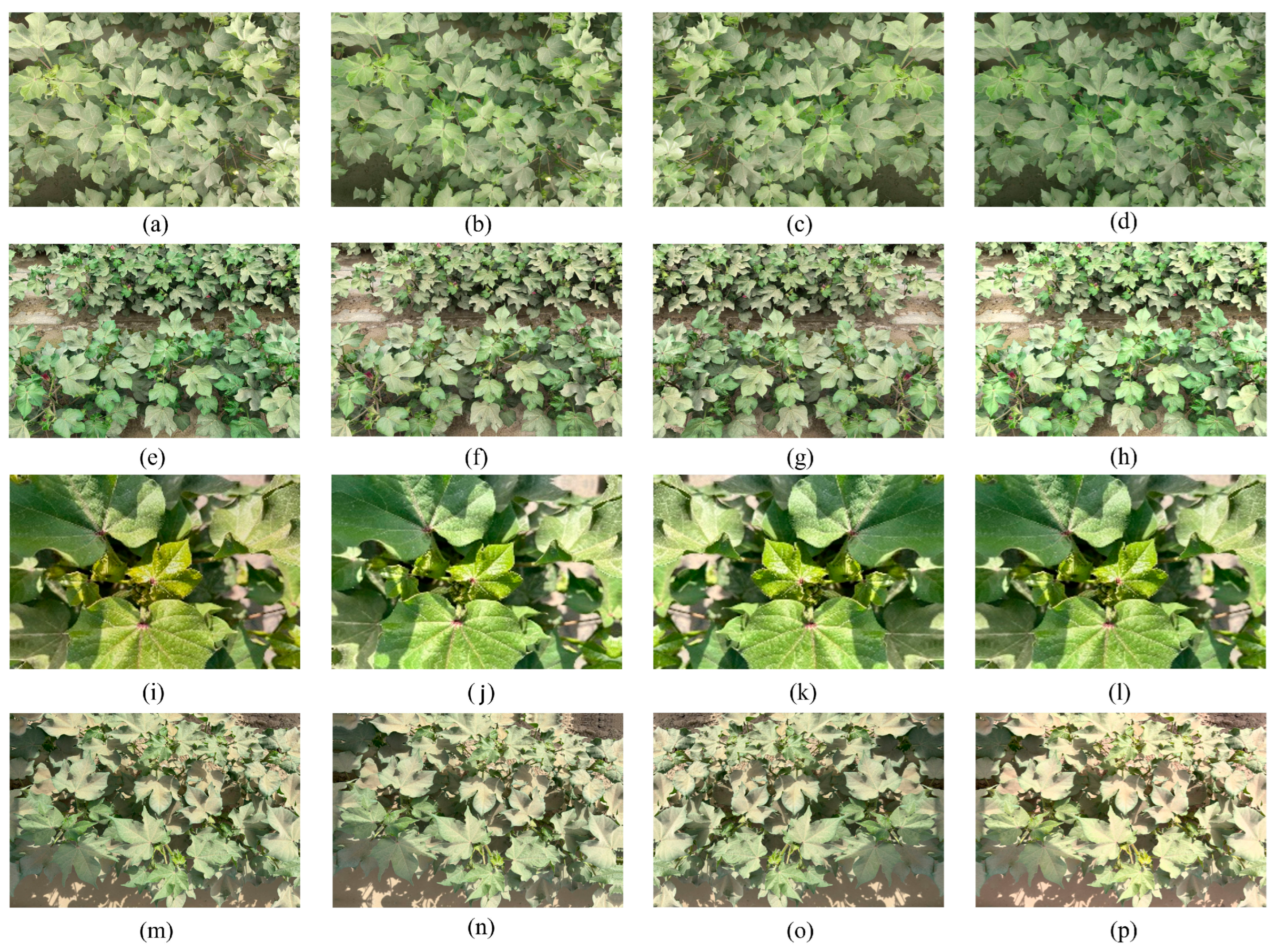 Examples of data augmentation. Top row: Densely occluded leaves—(a) color and growth state adjustment, (b) geometric transformation, (c) mirroring combined with noise addition, (d) color variation. Second row: Overlapping canopy leaves—(e) color and growth state adjustment, (f) geometric transformation, (g) mirroring combined with noise addition, and (h) color variation. Third row: Unobstructed single-plant leaves—(i) color and growth state adjustment, (j) geometric transformation, (k) mirroring combined with noise addition, (l) color variation. Bottom row: Dust-adhered leaves—(m) color and growth state adjustment, (n) geometric transformation, (o) mirroring combined with noise addition, (p) color variation.