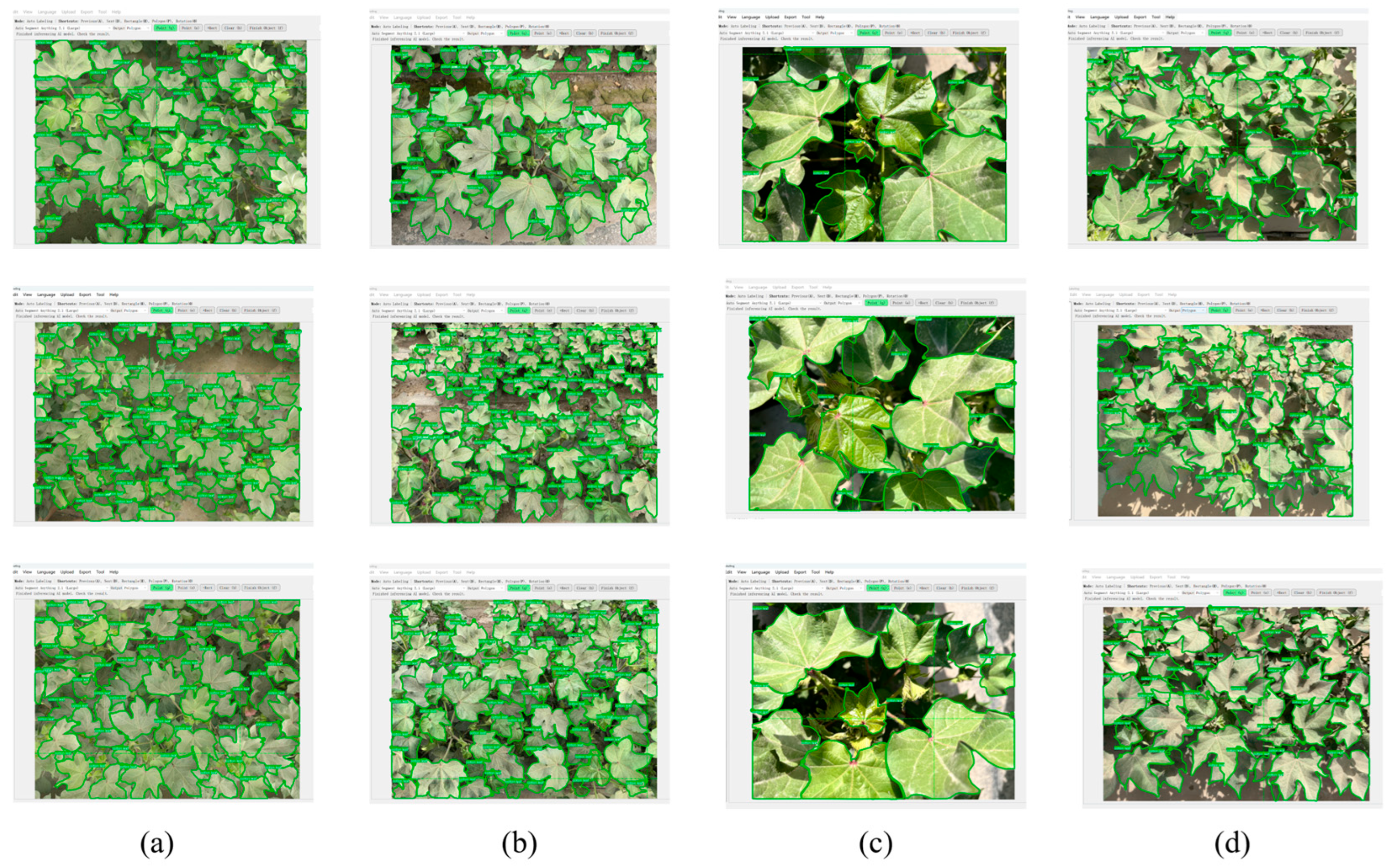 Annotation results from the purely manual workflow. (a) Densely occluded leaf, (b) overlapping leaves within the canopy, (c) isolated and unobstructed leaf, (d) leaf with dust deposition. The green dashed line is part of the annotation software’s interface captured in the screenshot.