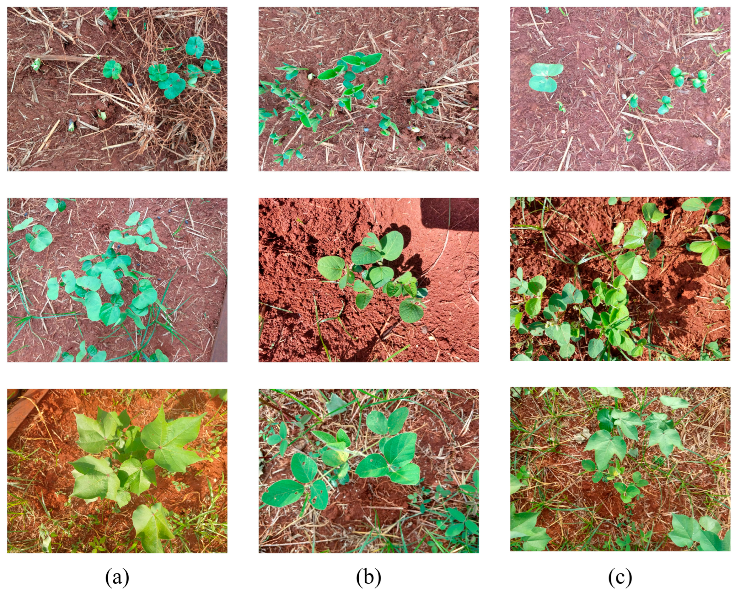 Examples from the cross-crop evaluation dataset. (a) Pure cotton leaf images; (b) pure soybean leaf images; (c) mixed cotton-soybean leaf images.