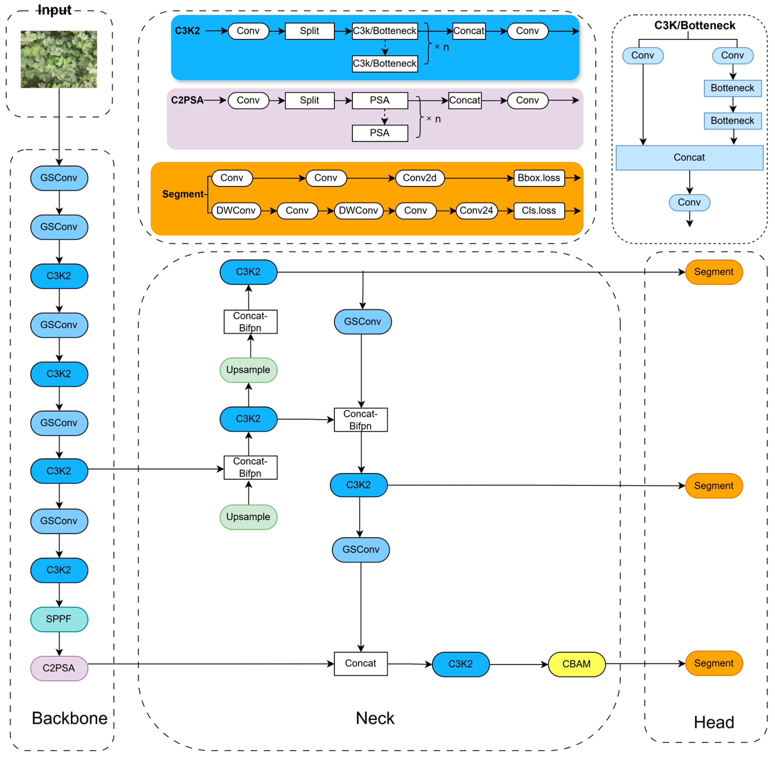 | Group | Gsconv | BiFPN | CBAM | P(B) | R | mAP50 | mAP50–95 | P(M) | R | mAP50 | mAP50–95 | FPS | GFLOPs |