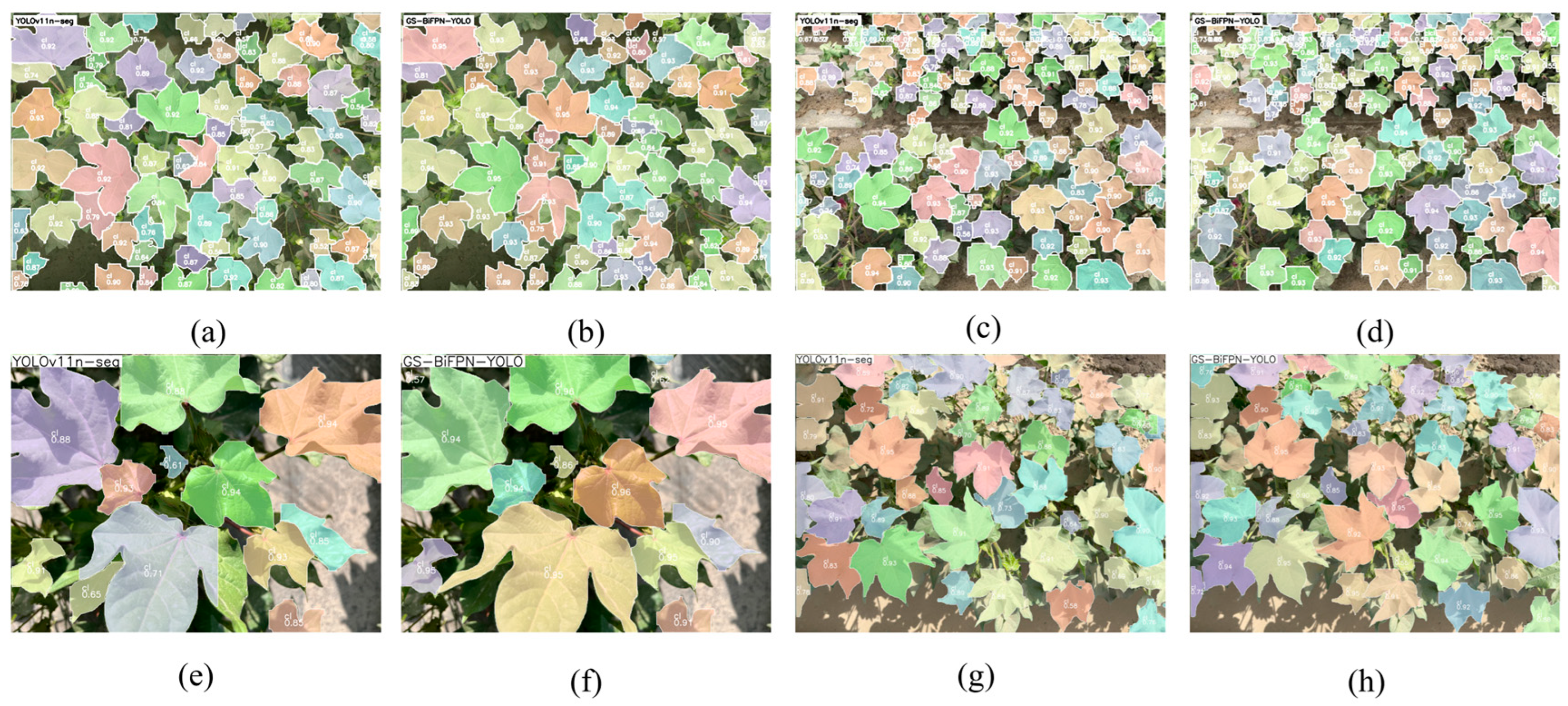 This figure demonstrates a comparative analysis of segmentation performance between YOLOv11n-seg and GS-BiFPN-YOLO. (a) Dense occluded leaf images segmented via YOLOv11n-seg. (b) Dense occluded leaf images segmented via GS-BiFPN-YOLO. (c) Overlapping canopy leaf images segmented with YOLOv11n-seg. (d) Overlapping canopy leaf images segmented with GS-BiFPN-YOLO. (e) Single, unobstructed leaf images processed by YOLOv11n-seg. (f) Single, unobstructed leaf images processed by GS-BiFPN-YOLO. (g) Images of dusty leaves segmented via YOLOv11n-seg. (h) Dust-adhered leaf images segmented with GS-BiFPN-YOLO.