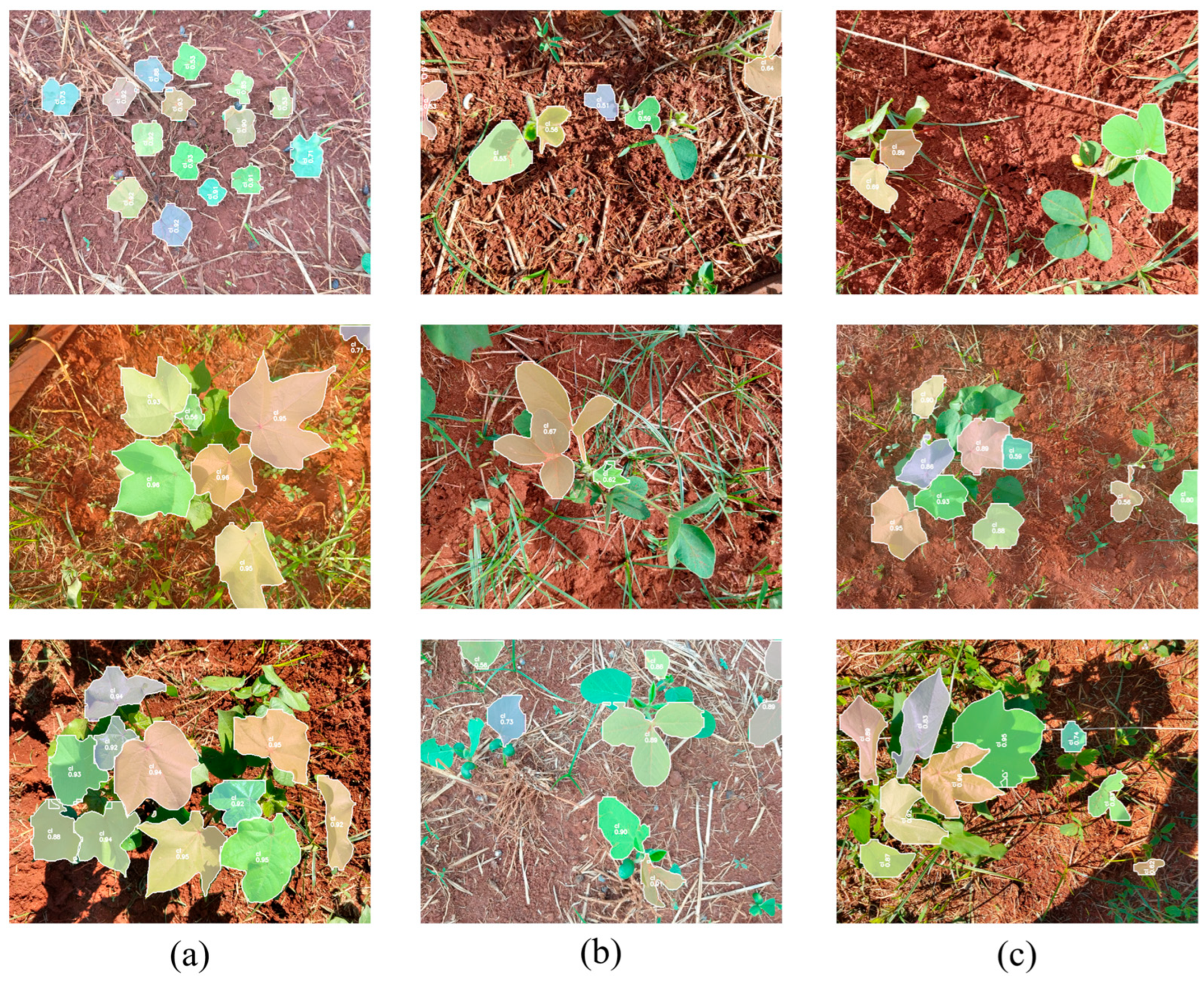 Cross-crop segmentation results. (a) Pure cotton leaf segmentation; (b) pure soybean leaf segmentation; (c) mixed cotton-soybean segmentation. The model maintains high segmentation quality across different crop types with minimal confusion between species.