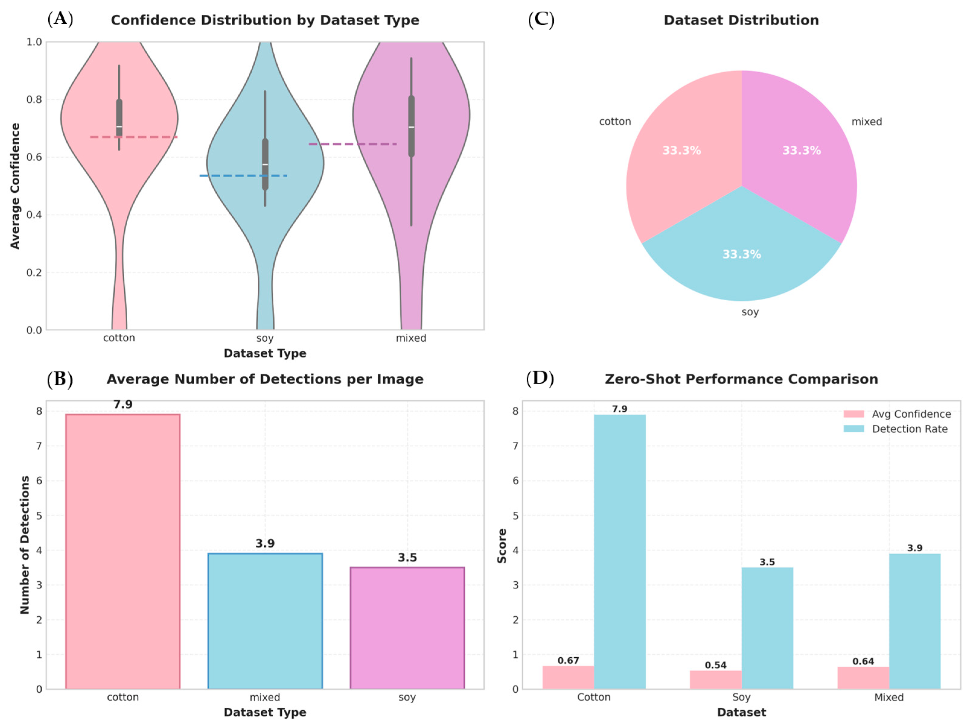 Performance metrics and dataset composition across crop types. (A) Average confidence score for cotton, soybean, and mixed image datasets. (B) Average number of object detections per image for each dataset type. (C) Dataset composition pie chart, showing an equal distribution of images across the three types (one-third each). Percentages are rounded to one decimal place for presentation. (D) Zero-shot performance comparison, plotting average detection rate against average confidence for each dataset type.