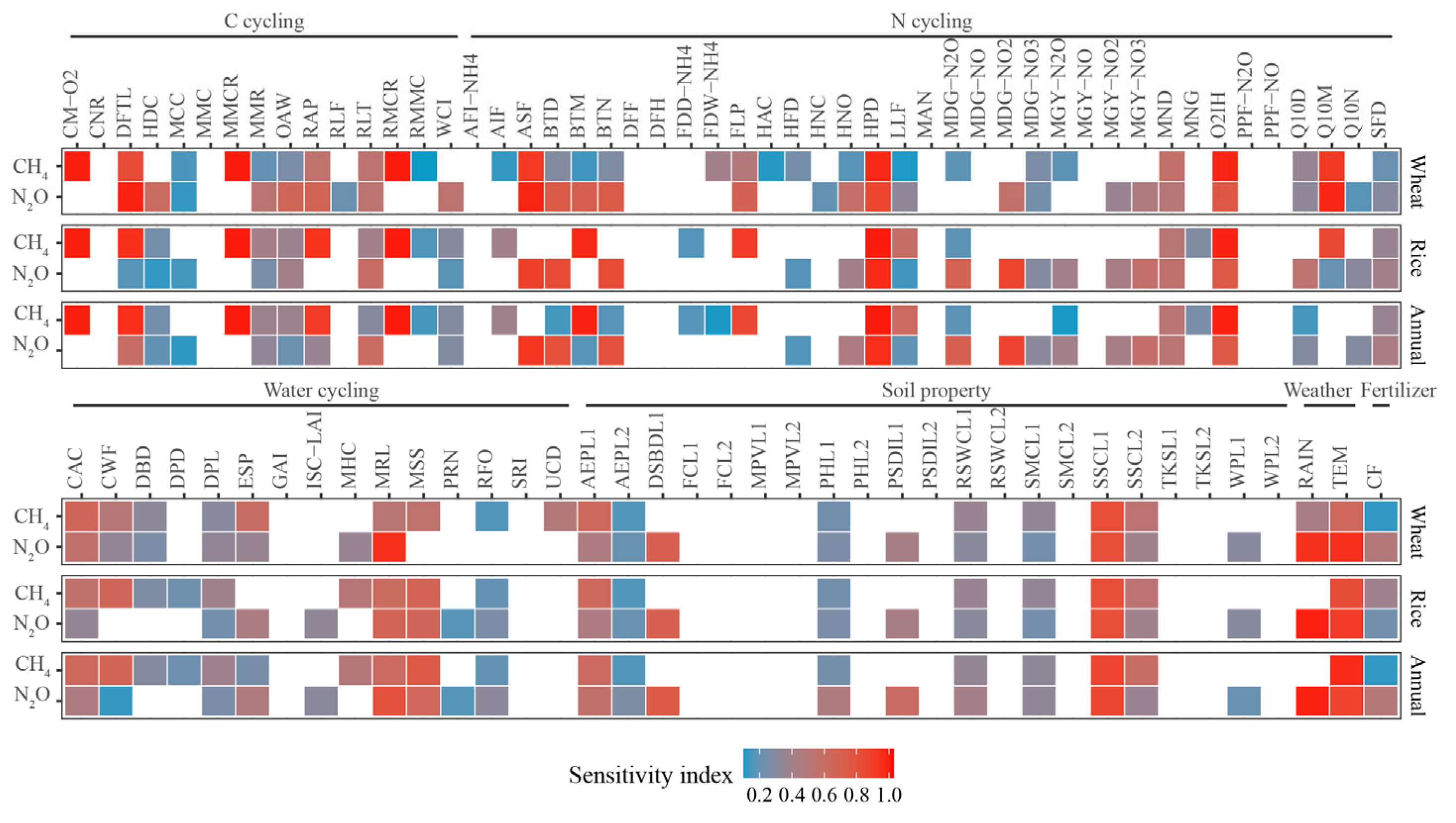Sensitivity Analysis of N2O and CH4 Emissions in a Winter Wheat–Rice Double Cropping System