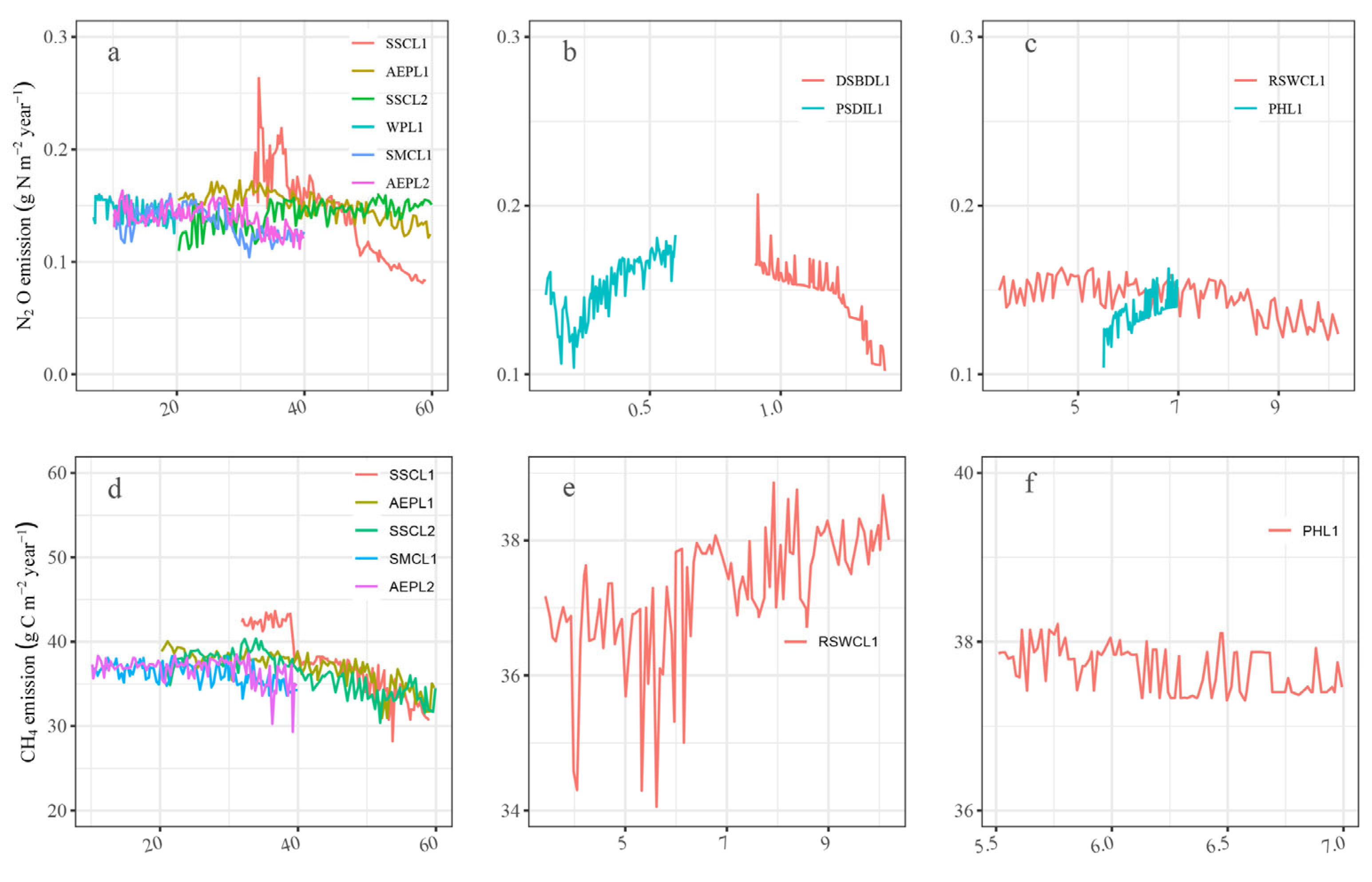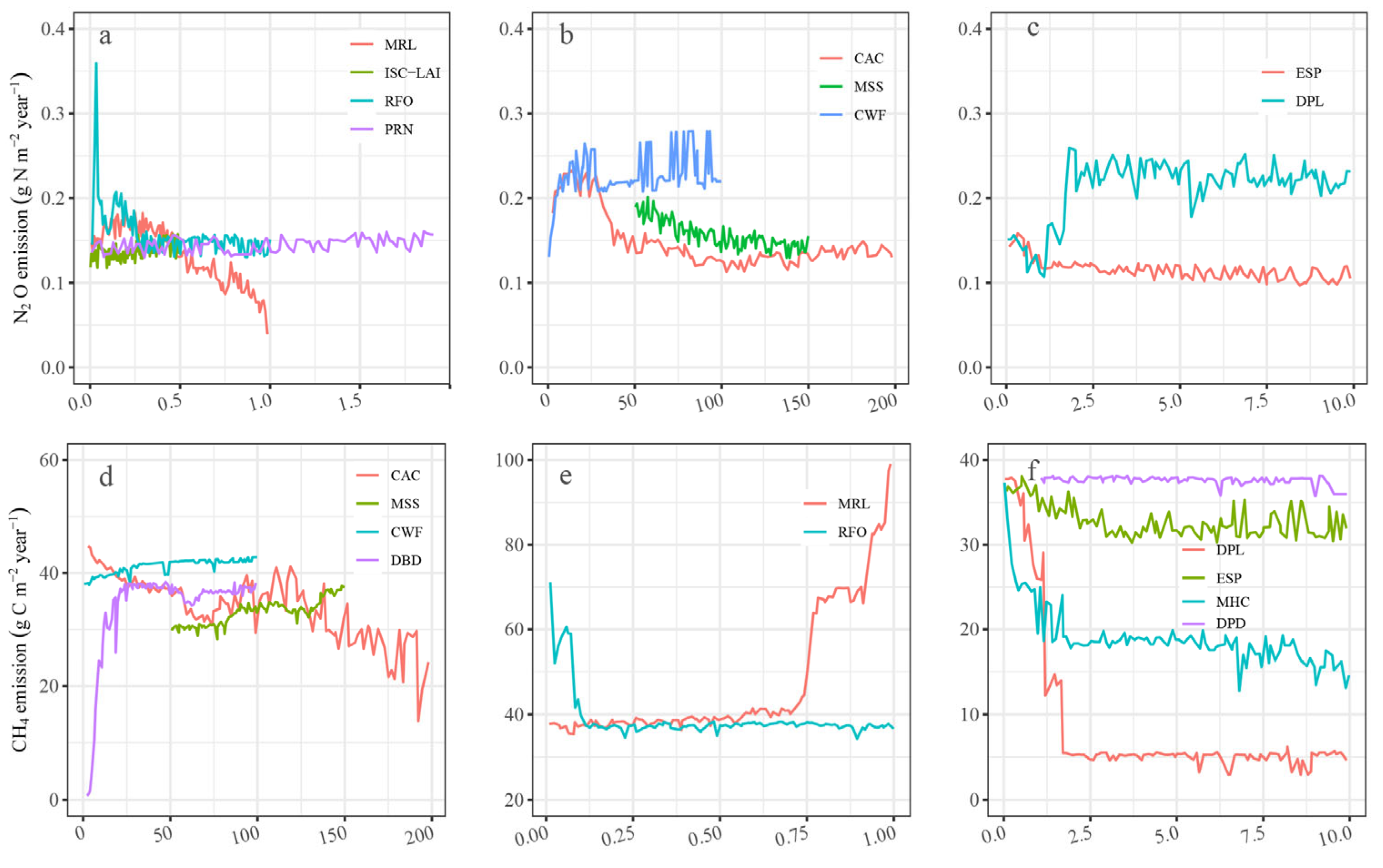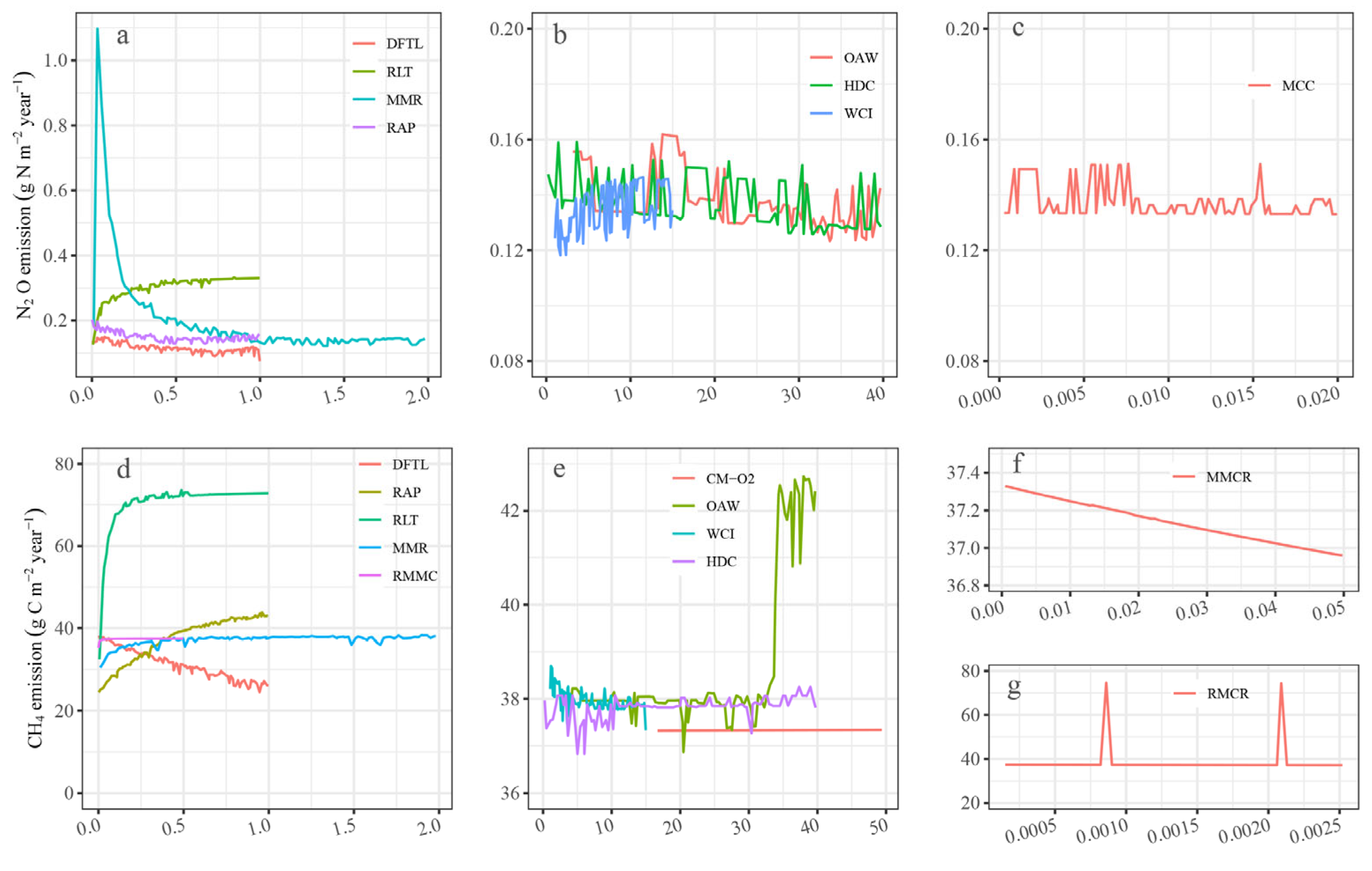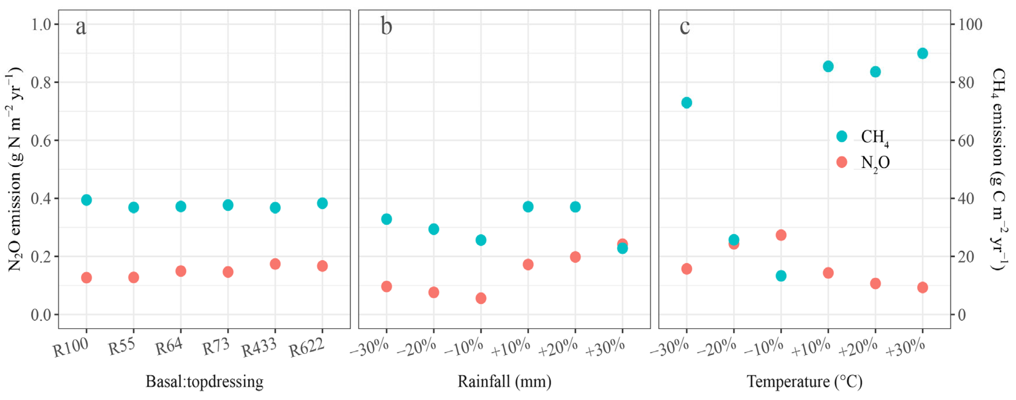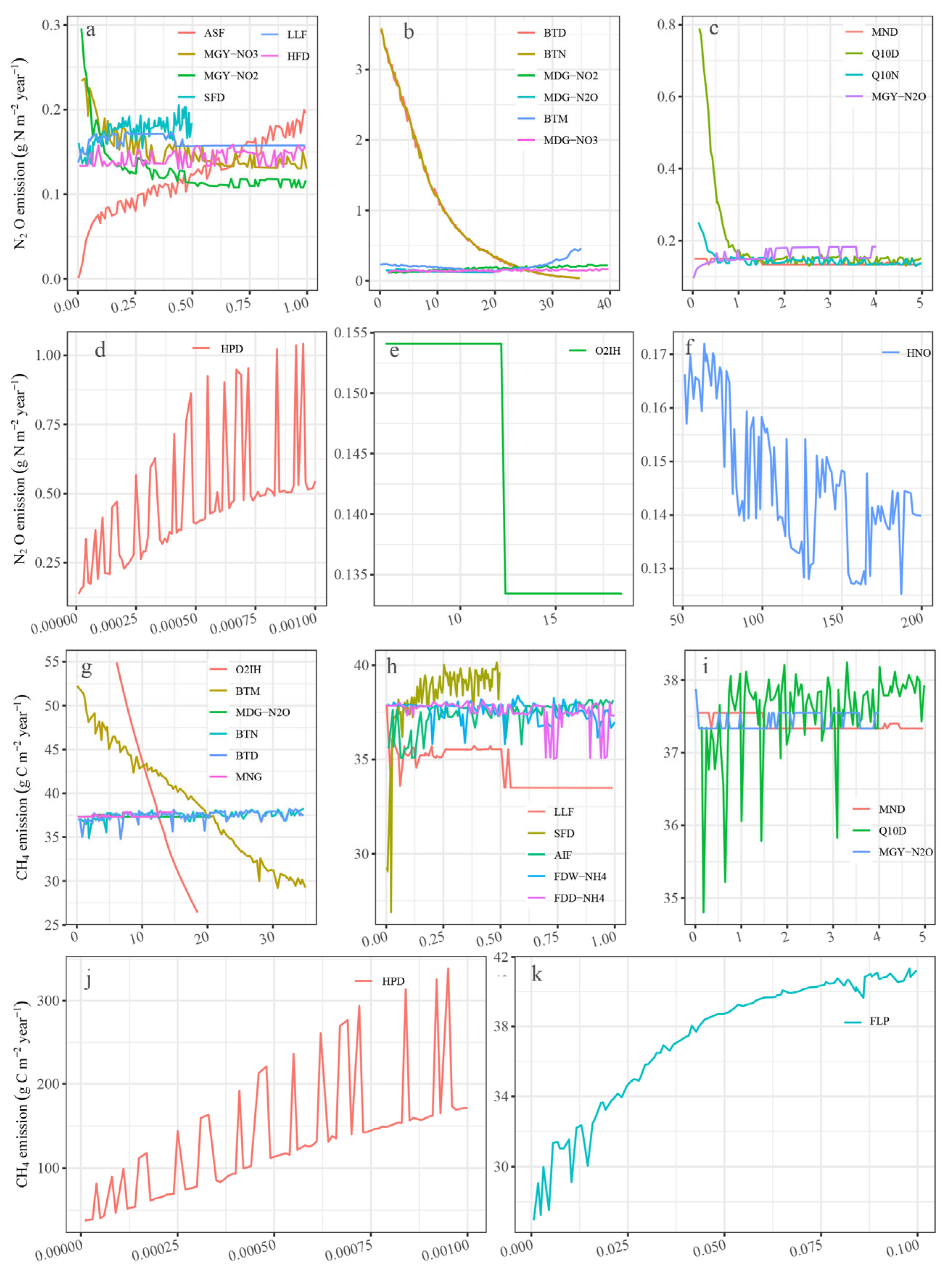 3.2. Relationships Between Simulated N2O and CH4 Emissions and Model Processes Parameters