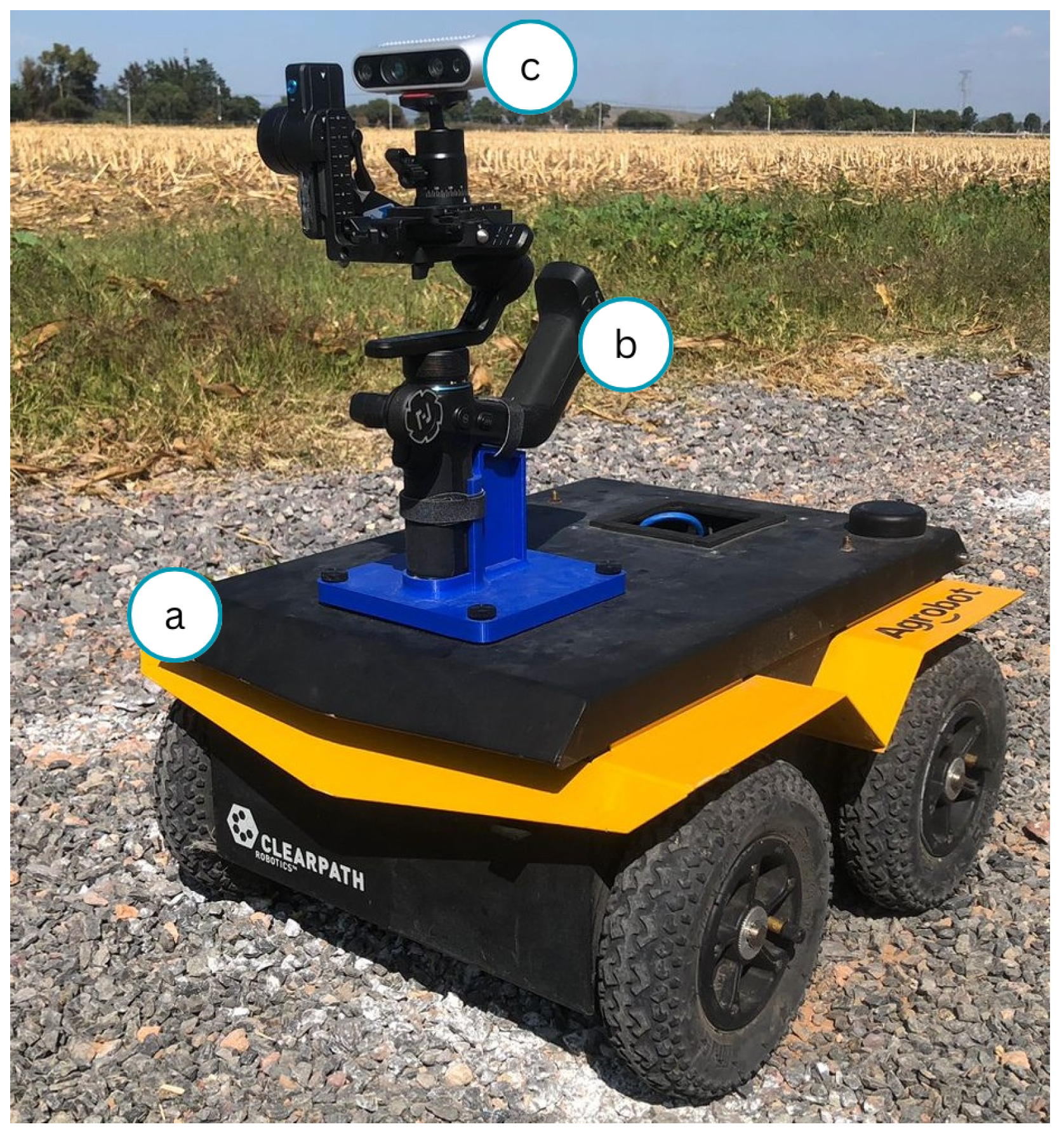 The robotic platform used in this research is the Jackal UGV from Clearpath Robotics (Kitchener, ON, Canada), a skid-steer mobile robot designed for field robotics research (see “a” in