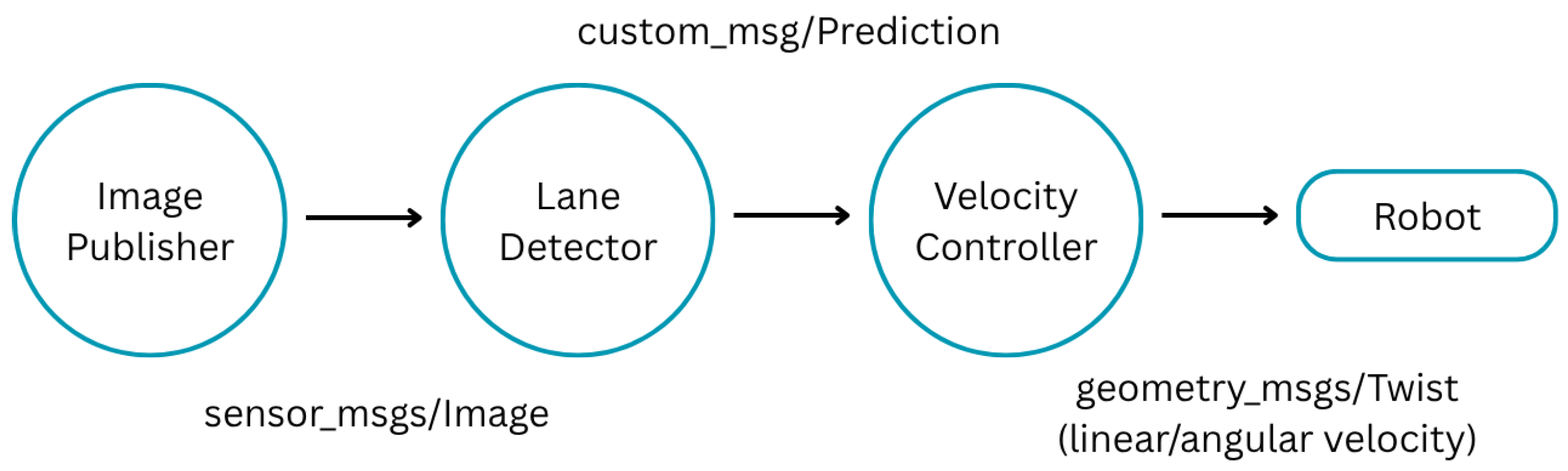 Figure 5 illustrates the ROS node architecture where the Image Publisher node acquires frames from the Intel RealSense D435 at 1280 × 720 resolution and 15 FPS, the Lane Detector node processes these frames to predict lane boundaries, and the Velocity Controller node computes and publishes linear and angular velocities to actuate the robot.