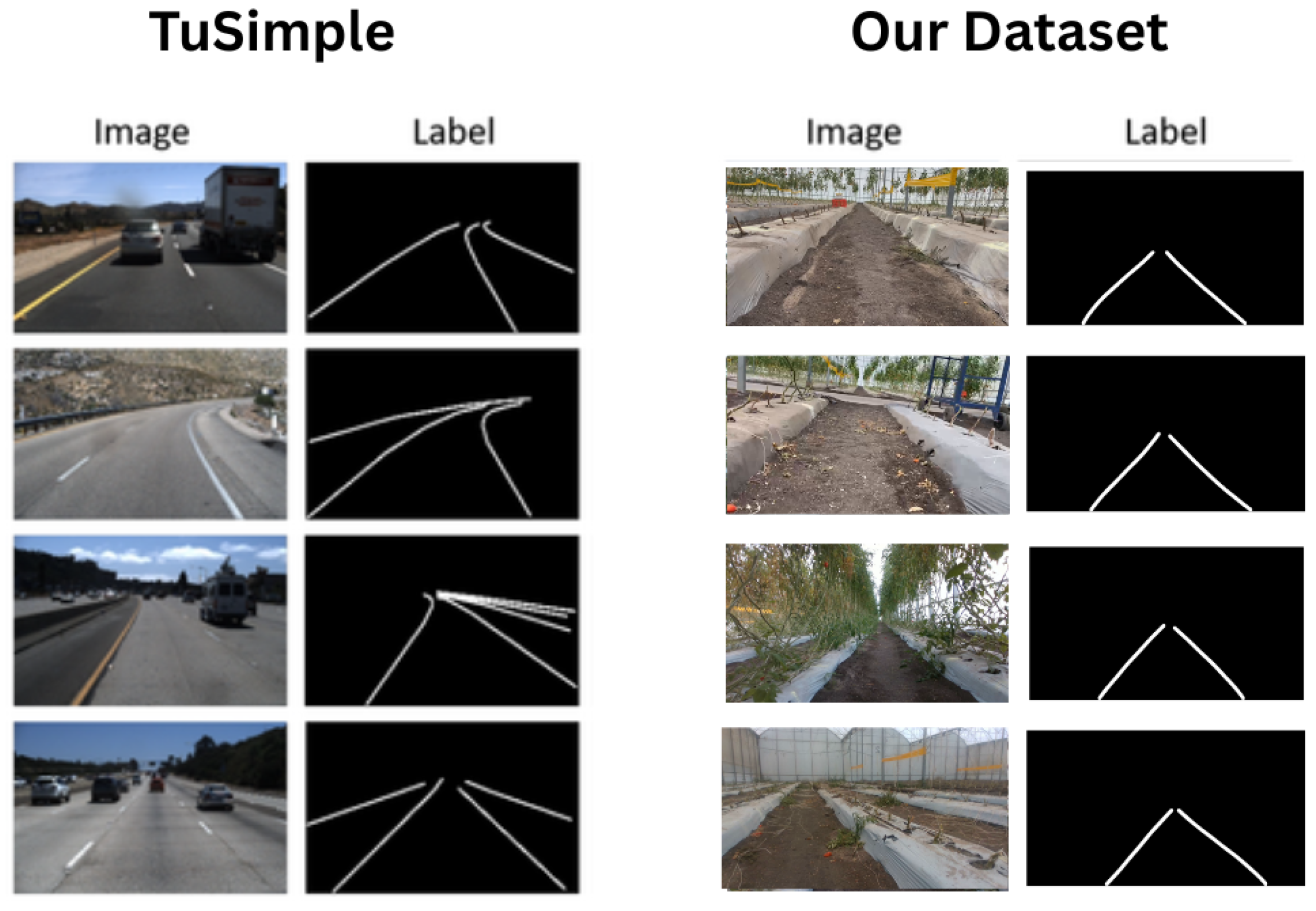 Although the TuSimple dataset is based on various driving scenarios, which differ significantly from the current application (greenhouse navigation), it can still be used for pre-training the network. Pre-training on TuSimple enables the network to learn visual features such as edge detection, line recognition, and spatial relationships that are transferable across domains. These low-to-mid-level features learned from detecting road lanes provide a foundation that can be fine-tuned for detecting navigation paths in greenhouses, resulting in faster convergence and better performance than training from scratch with limited greenhouse data alone. The large size of the dataset allows for the effective initialization of the network before fine-tuning it with the dataset prepared.