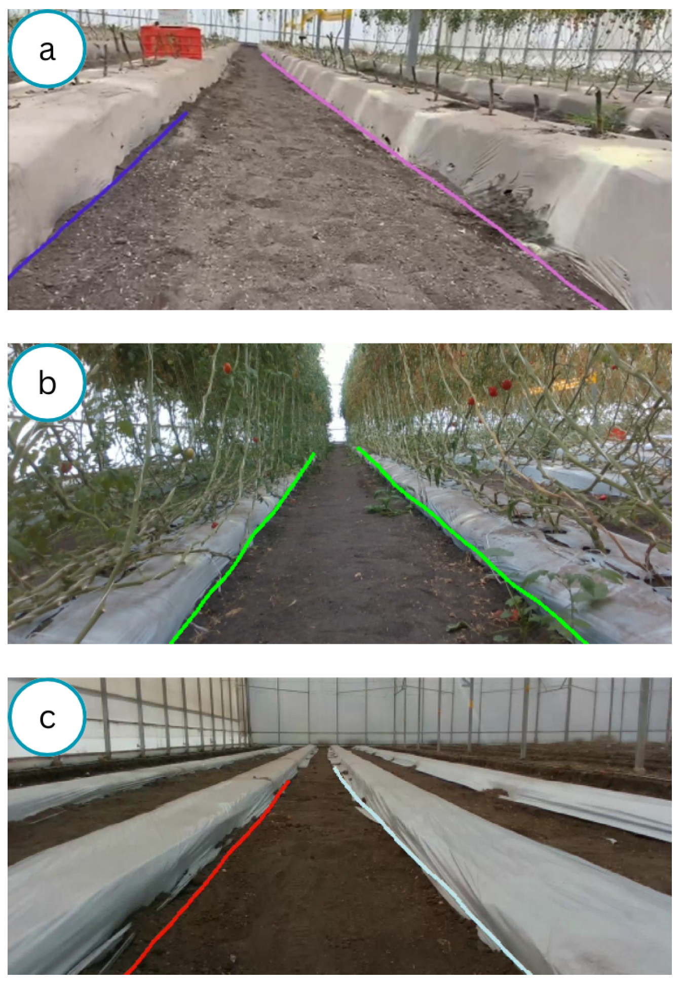 28] was prepared in a greenhouse scenario, following the TuSimple annotation format. This choice was made because the network’s dataloader is compatible with datasets in this format. To create the dataset, videos were recorded over a one-year period by mounting the camera atop the Jackal while navigating through the greenhouse at three distinct cultivation stages: during initial tomato growth, at harvest maturity, and post-harvest conditions. These videos were then divided into multiple frames, which were then labeled to indicate where the lanes should be. The two different datasets used to train the model can be seen in