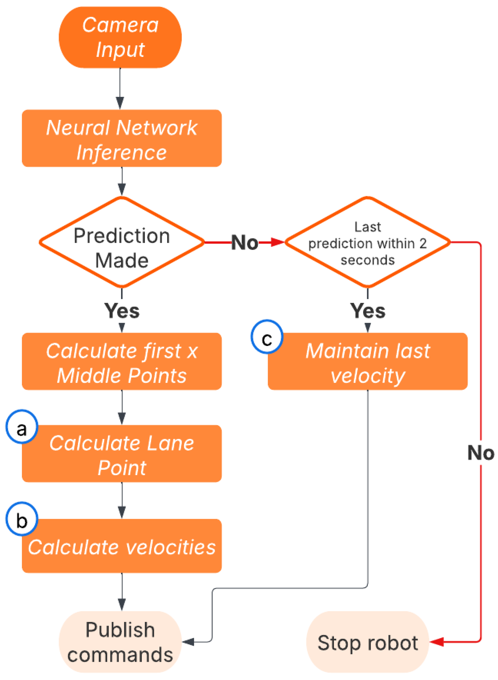 Figure 9). To enhance robustness, when no lane prediction is detected, the system maintains the previous control commands for up to two seconds. If no valid prediction is received for more than two seconds, such as during temporary occlusions or other failure scenarios, the robot is brought to a complete stop to ensure safe operation (“c” in