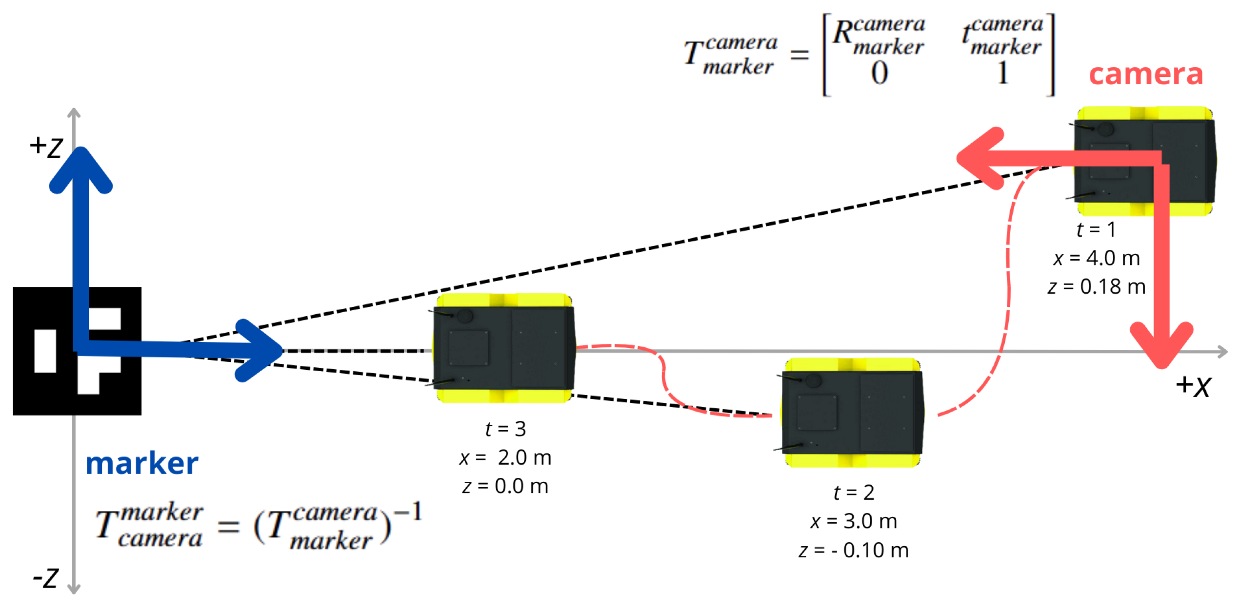 is the translation vector. From this, the inverse transformation provides the camera pose with respect to the marker frame: