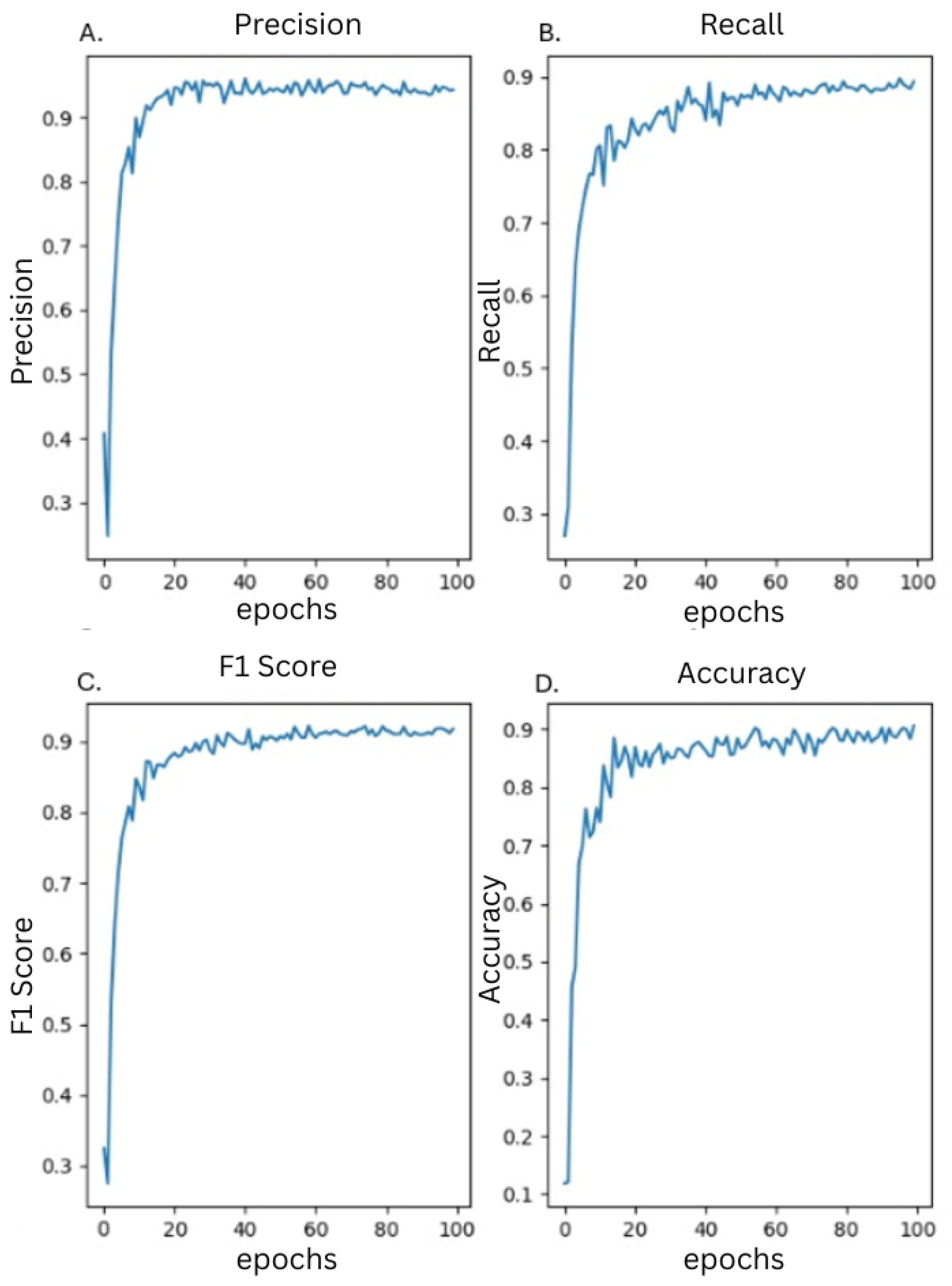 Figure 11, where in less than 20 epochs, the model achieved an F1 Score, accuracy, and precision above 85.