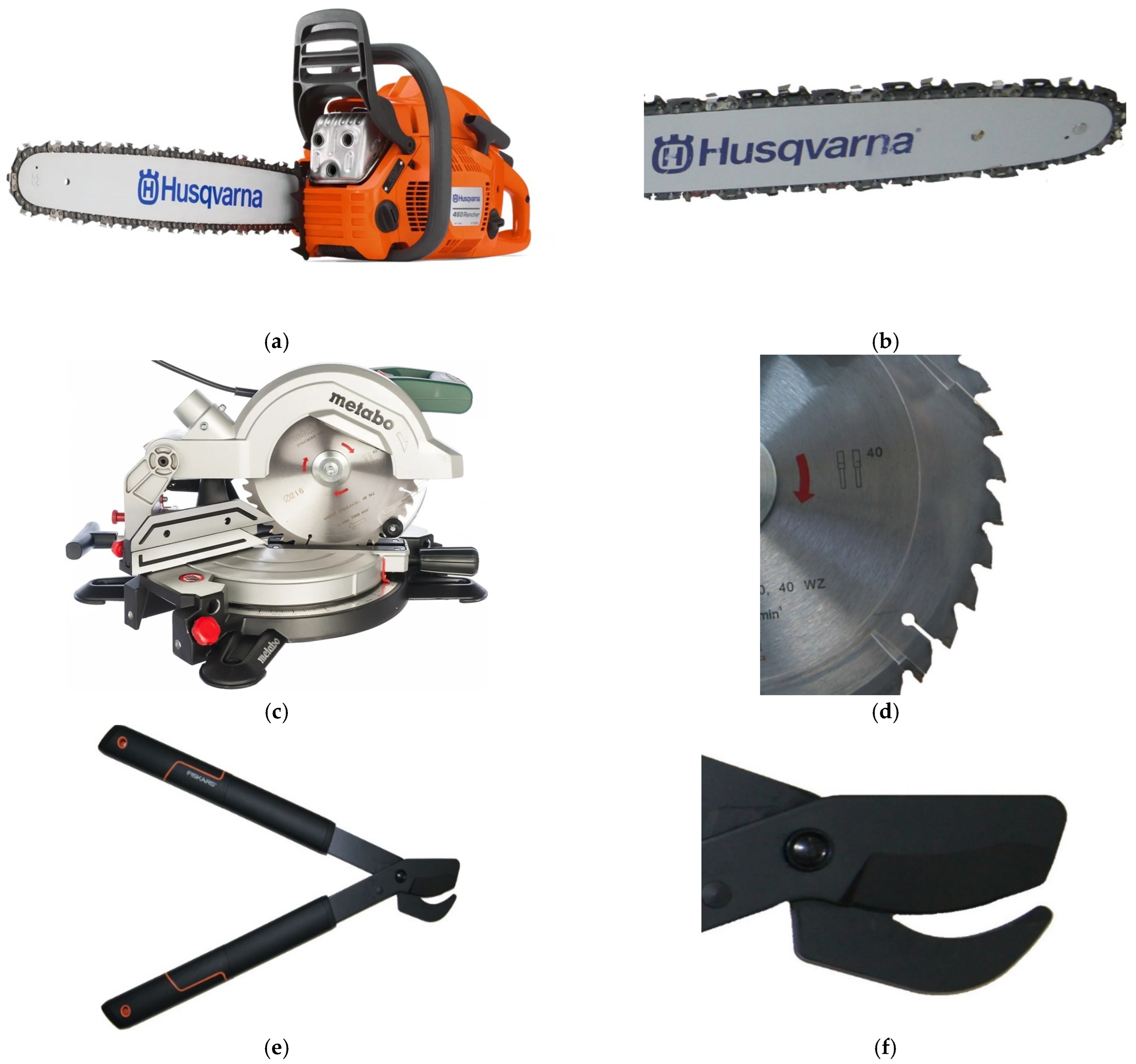 - Robb, W.; Nevrkla, P. Assessment of Portable Chainsaw Chains. Arboric. J. 2020, 42, 228–236. [Google Scholar] [CrossRef]