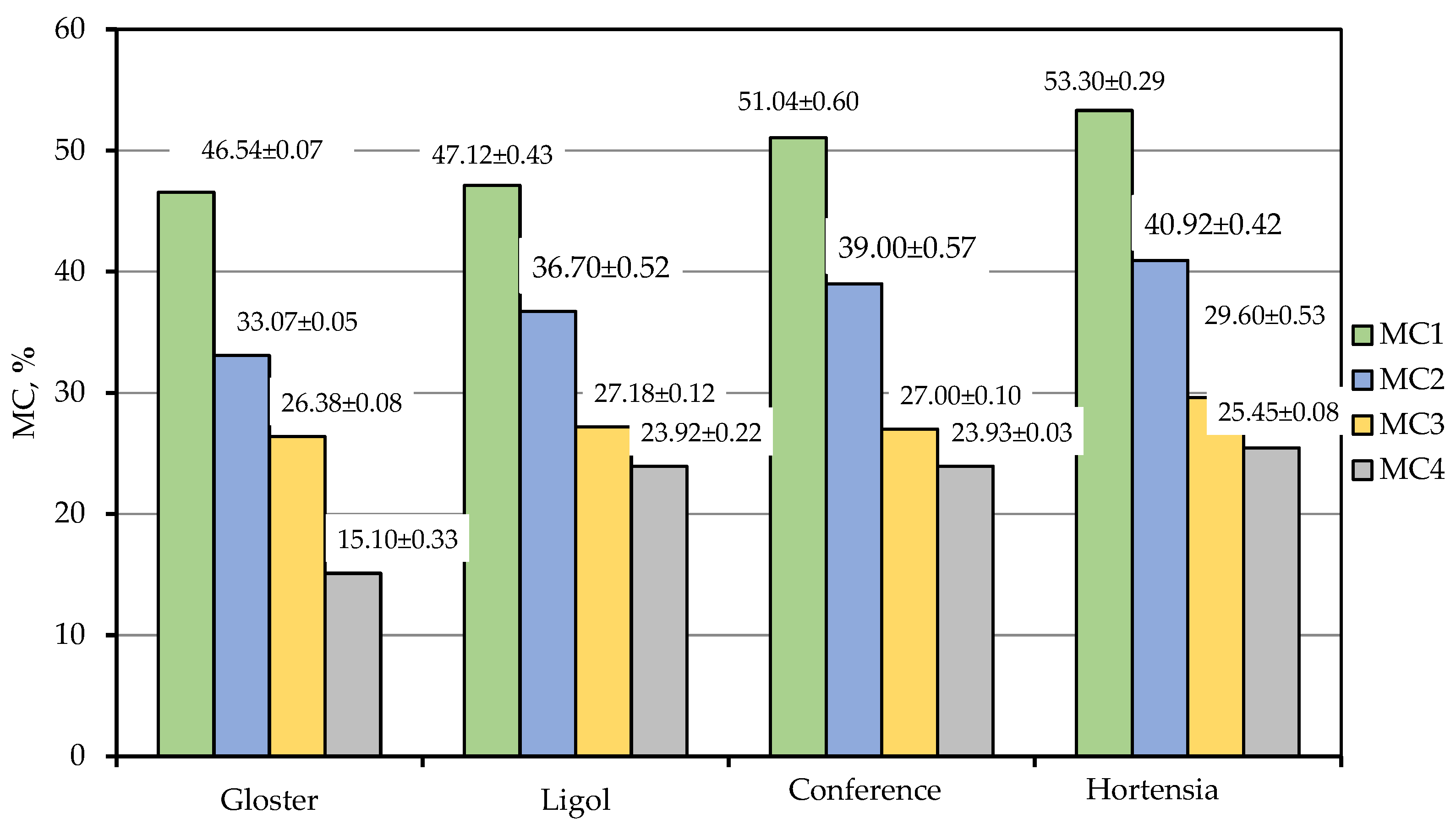 - Nadulski, R.; Wróblewska-Barwińska, K.; Strzałkowska, K. Experimental characteristic of textural properties of the selected varieties of pears. Agric. Eng. 2012, 16, 165–173. [Google Scholar]