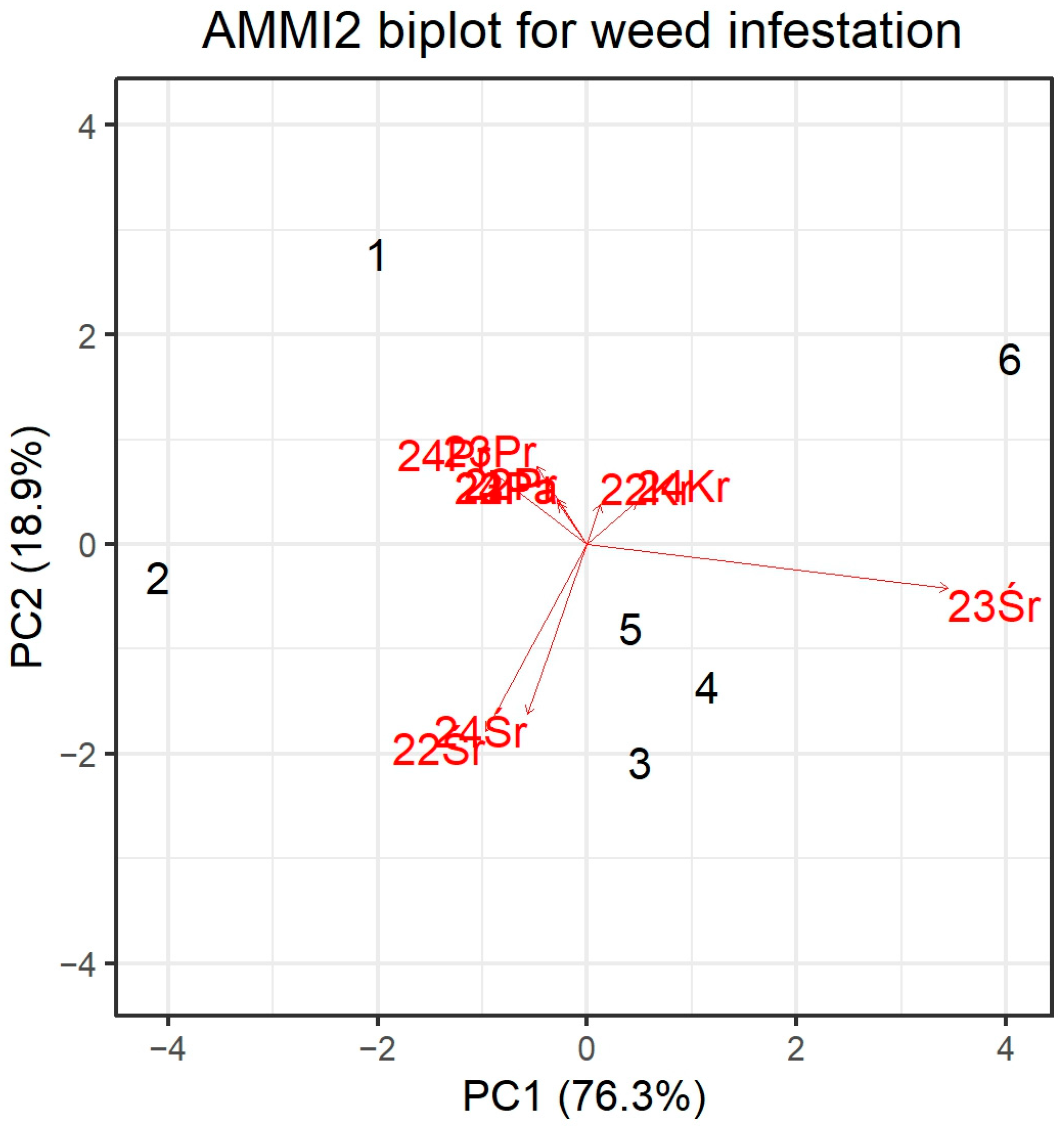 3.1.2. Genotype-Environment Interaction Structure (AMMI) for Weed Infestation