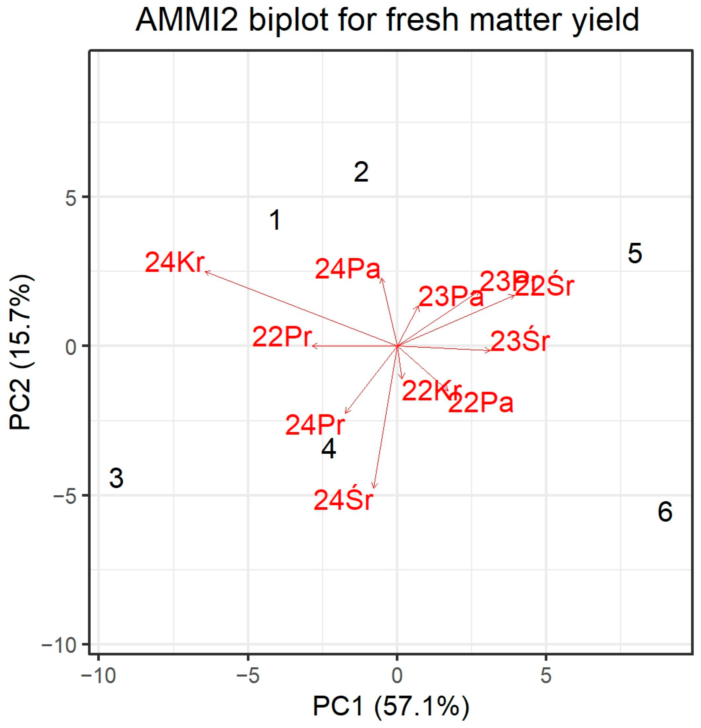 3.3.2. Genotype-Environment Interaction Structure (AMMI) for Fresh Matter Yield
