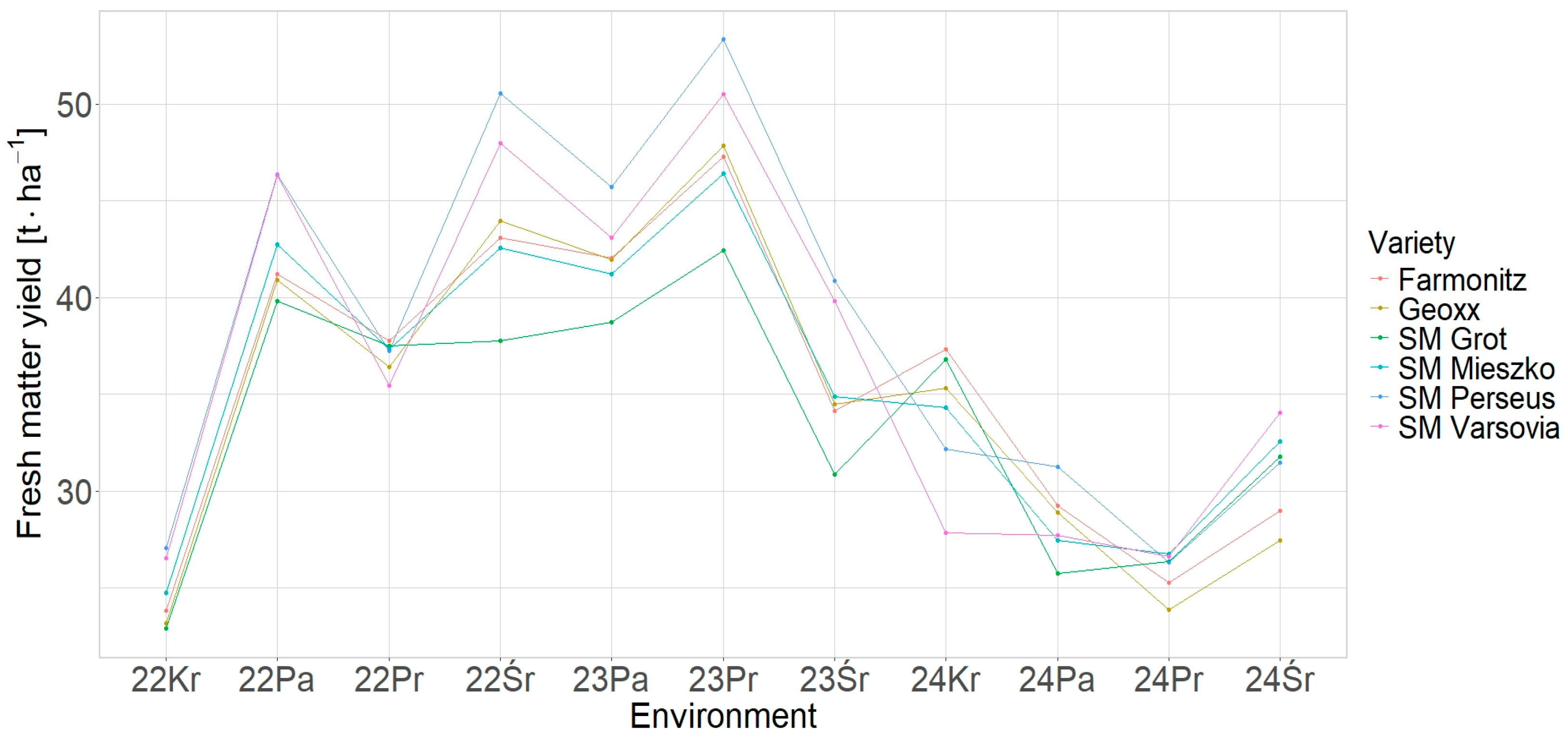 3.3.1. Environmental Variation in Fresh Matter Yield