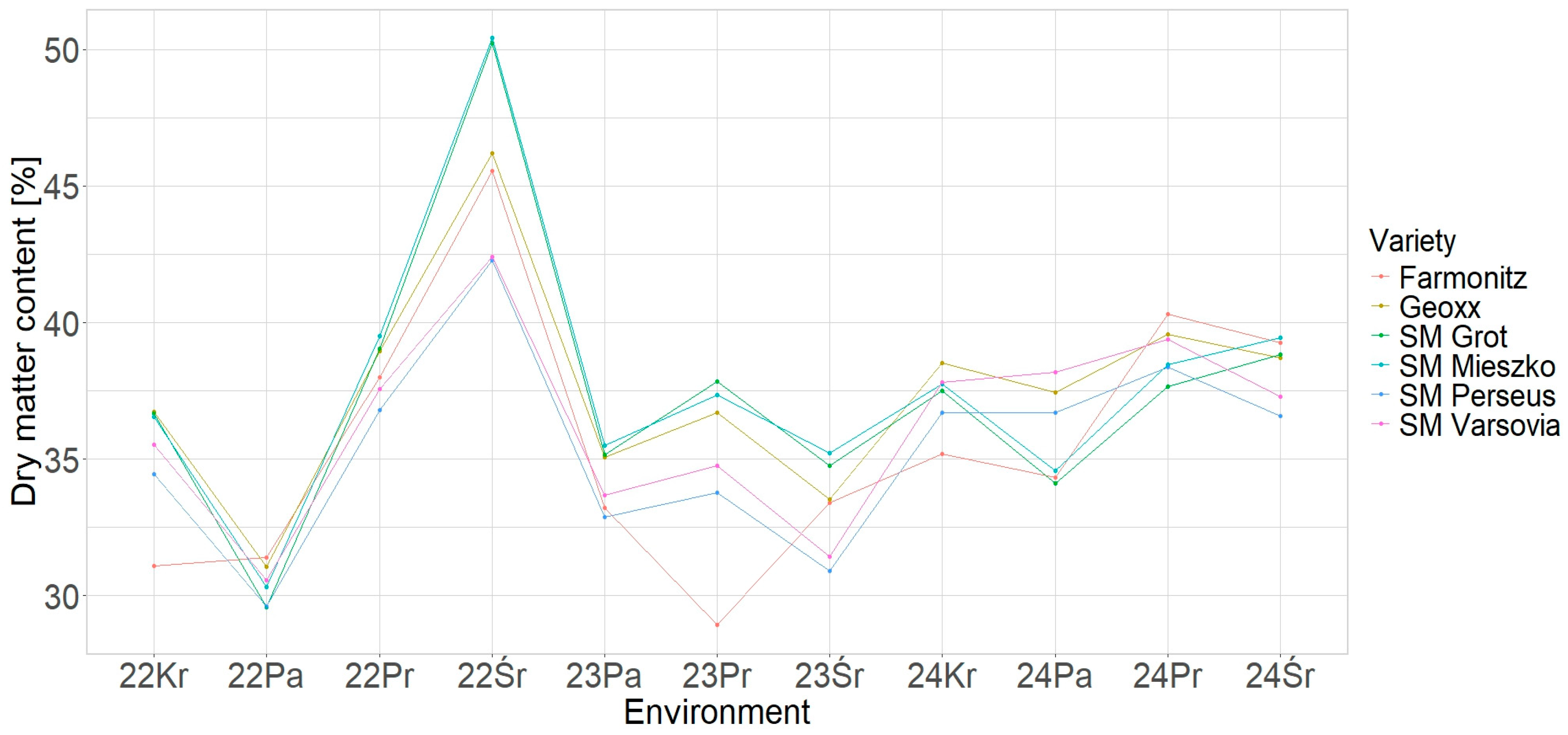 3.4.1. Environmental Variation in Dry Matter Content