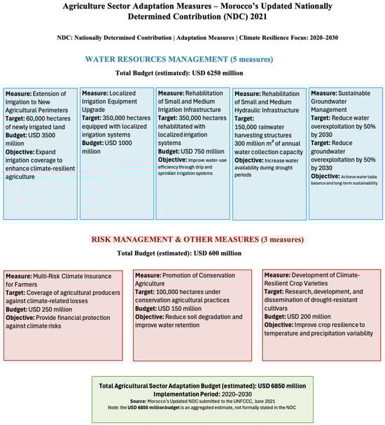 Morocco’s Updated Nationally Determined Contribution (NDC 2021) [15] outlines a comprehensive framework for addressing these emission hotspots through complementary adaptation and mitigation strategies. Eight adaptation measures prioritize the resilience of water resources. Water resource management comprises five measures with an estimated cost of 6.25 billion USD, and risk management consists of three measures with an estimated cost of 600 million USD, totaling 6.85 billion USD for 2020–2030. Figure 1 and Figure 2 summarize the adaptation and mitigation measures for the agricultural sector in the Updated NDC.