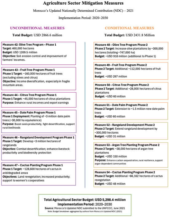 Agriculture sector mitigation measures outlined in Morocco’s Updated Nationally Determined Contribution (NDC 2021) [15]. Source: Morocco’s Updated NDC, 2021 [15].