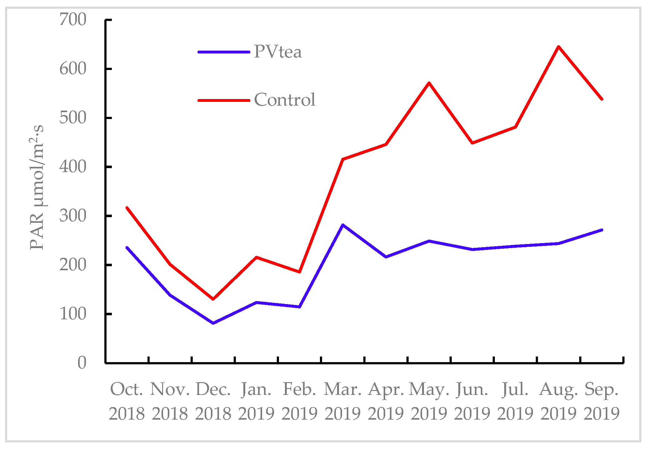 3.7. Effect of PV Modules on Resistance of Tea Plants to Environmental Stress
