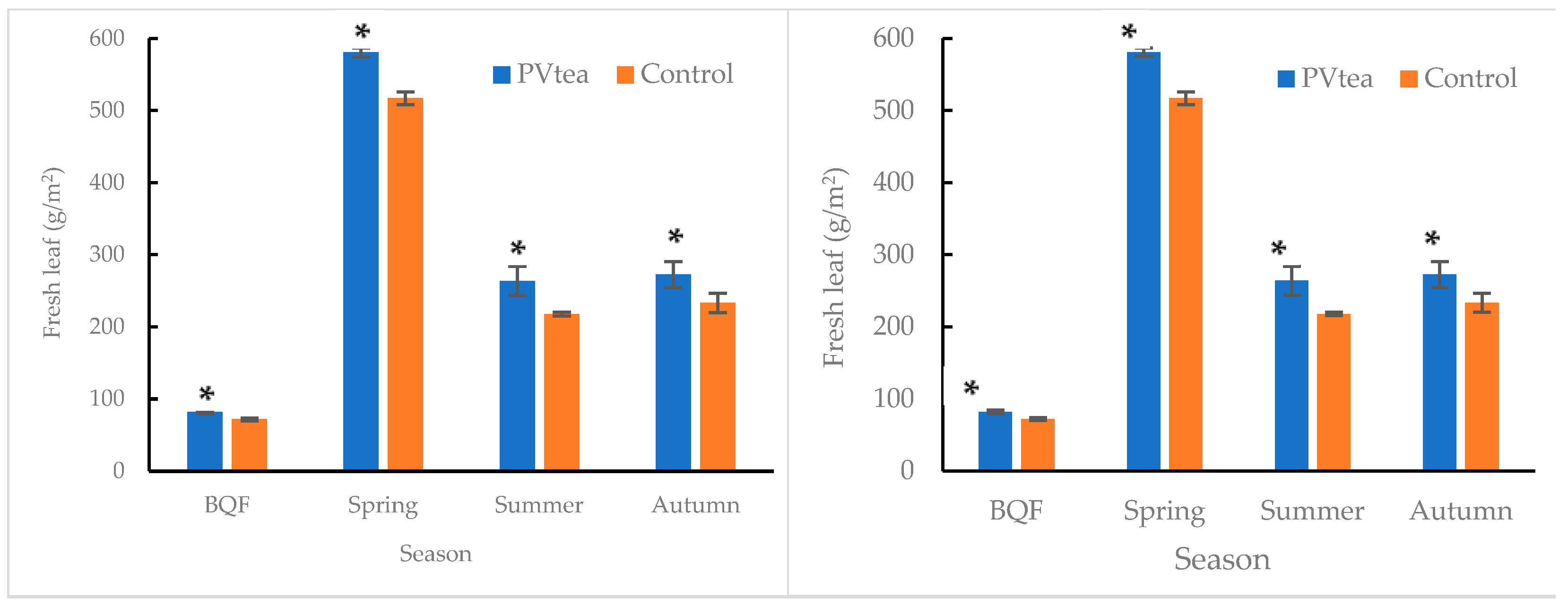 3.4. Effects of PV Modules on Fresh Leaf Yield