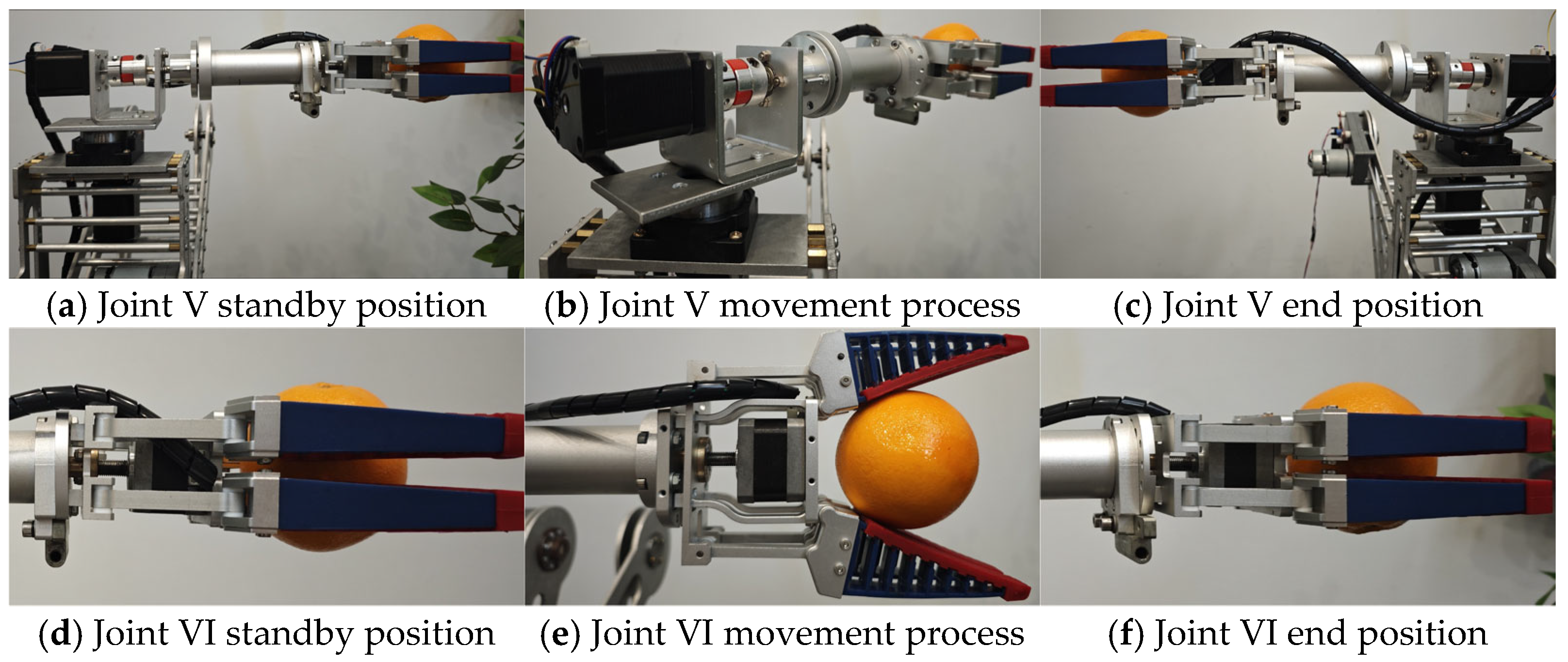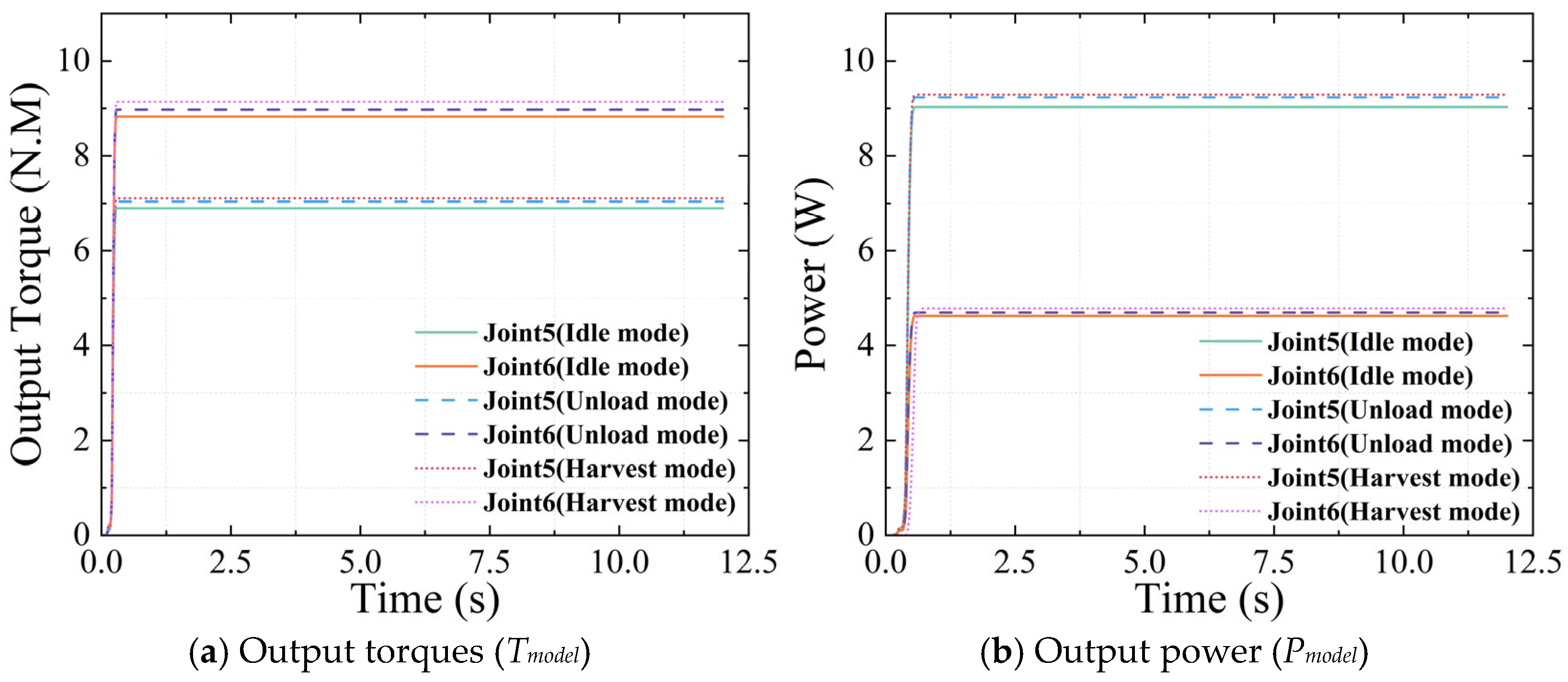 - Experimental validation is conducted to verify the proposed model. Results obtained from a dedicated test platform demonstrate that the model can accurately capture joint dynamics as well as energy transfer and dissipation, providing a theoretical basis for optimizing joint parameters and load allocation of the harvesting manipulator.