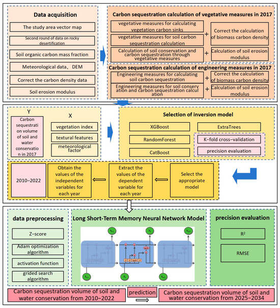 This study adopts a methodology of ‘mechanism elucidation–model construction–categorised quantification’, using vegetative measures, engineering measures, and cultivation measures as entry points for the soil and water conservation carbon sink quantification system. While cultivation measures are a component of the theoretical framework, they were not quantified in this study due to the lack of high-precision spatial data in the study area. This study focuses on carbon sink mechanisms and quantification techniques. By integrating parameters such as vegetation indices and texture characteristics, machine learning regression algorithms are employed to reconstruct long-term time series of carbon sink quantities of soil and water conservation, and LSTM models are used to predict the carbon sink level of future soil organic carbon (SWC). These research results have reference value for improving the carbon sink accounting system and are important for promoting the development and transaction of soil organic carbon sinks and helping to achieve China’s “double carbon” goal.