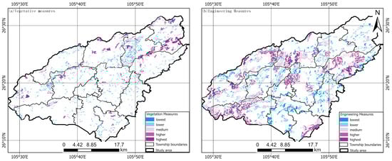 (a) shows the spatial distribution map of carbon sequestration capacity classified for afforestation and vegetative measures in Puding County; (b) depicts the spatial distribution map of carbon sequestration capacity classified for engineering measures in Puding County.