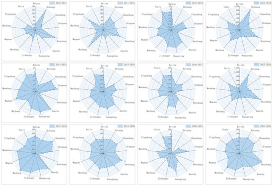 Figure 10b presents the spatial distribution of the absolute values of carbon sink fluctuations in adjacent years from 2025 to 2034, showing the spatial heterogeneity and temporal dynamics of urban carbon sink variables in the next ten years under engineering measures. In terms of space, high-value areas are concentrated in Machang, Huaqiu, Huangtong Subdistrict, Maguan, Baiyan, Dingnan Subdistrict, and Pingshang Town. This may be due to the phased implementation of major regional projects, such as mine ecological restoration and water conservancy infrastructure construction, policy changes, or sudden environmental events. Specific verification still needs to rely on field data. Low-value areas include Houchang, Maodong, Bulang Town, and Yuxiu Subdistrict. The fluctuations in these areas are generally relatively stable, which may be because of long-term planning and ecological adaptive engineering design, and the impact of project intervention on carbon sinks is relatively small. The chart presents the changes in annual towns. Jichangpo Town has a regular and obvious periodic fluctuation from 2025 to 2029, which may be related to planning measures such as terraced fields and reforestation, reflecting the progress of planned ecological management. Pingshang, Dingnan Subdistrict, Baiyan, Huangtong Subdistrict, and Maguan Town have a large absolute difference from 2028 to 2029, and there are very obvious yellow areas in the chart. This may be because the abnormal climate or cumulative pollution effect leads to obvious fluctuations in carbon sinks in the short term.