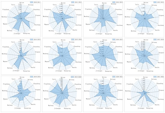 where represents the carbon sequestration capacity of vegetation under soil and water conservation forestry and vegetative measures, t/a; represents the soil carbon sequestration capacity of vegetative measures for soil and water conservation, t/a; represents the soil carbon sequestration capacity of engineering measures for soil and water conservation, t/a; represents the carbon fixation rate of trees and shrubs for soil and water conservation, t/(hm2·a); represents the current carbon density of vegetative measures; and represents the carbon density of vegetative measures n years ago, t/hm2. In this study, carbon fixed within the biomass of trees and shrubs—such as flowers, twigs, and leaves—is not included in vegetation carbon sequestration due to seasonal litterfall or removal, whereby this carbon returns to the atmosphere or soil [37]. represents the area of water and soil conservation among tree and shrub forests, hm2; represents the area of terraced land conversion, hm2; and represents the soil carbon sequestration rate of terraced land conversion, t/(hm2·a).