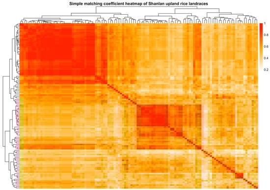 The simple matching coefficient (SMC) is a measure of genetic similarity between two Shanlan upland rice landraces based on the genotype’s comparison of molecular markers. The formula is as follows: