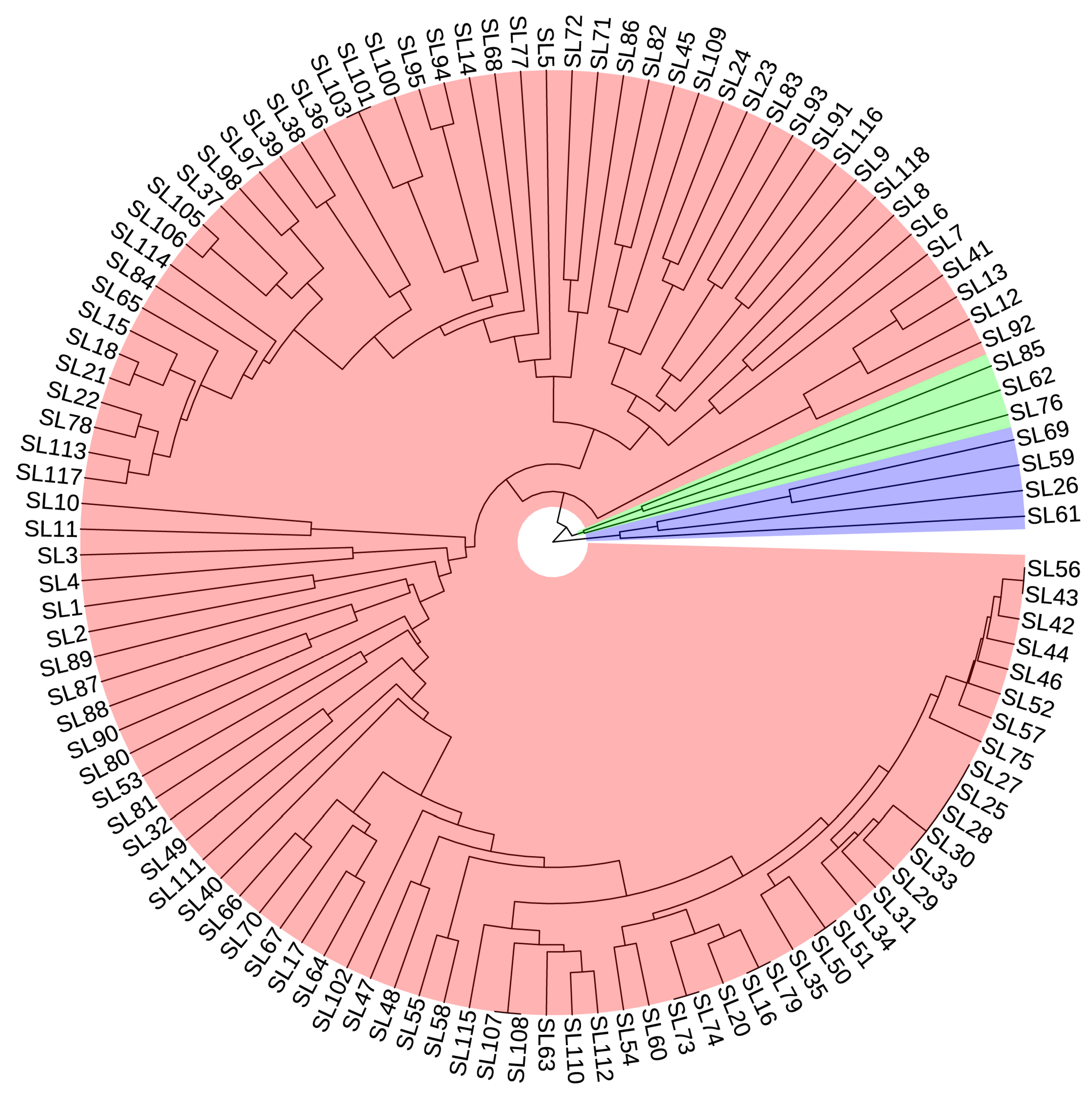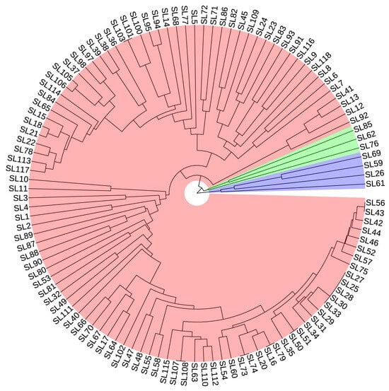 Figure 4. Clustering results of 114 Shanlan upland rice landraces based on 38 InDel marker pairs. The circular dendrogram illustrates the genetic relationships among 50 Shanlan upland rice landraces, with each landrace represented by an individual label (SL followed by a number). The branches are colored to highlight different genetic clusters, with green, red, and purple representing distinct groups within the collection. The closer the landraces are positioned on the tree, the more genetically similar they are.