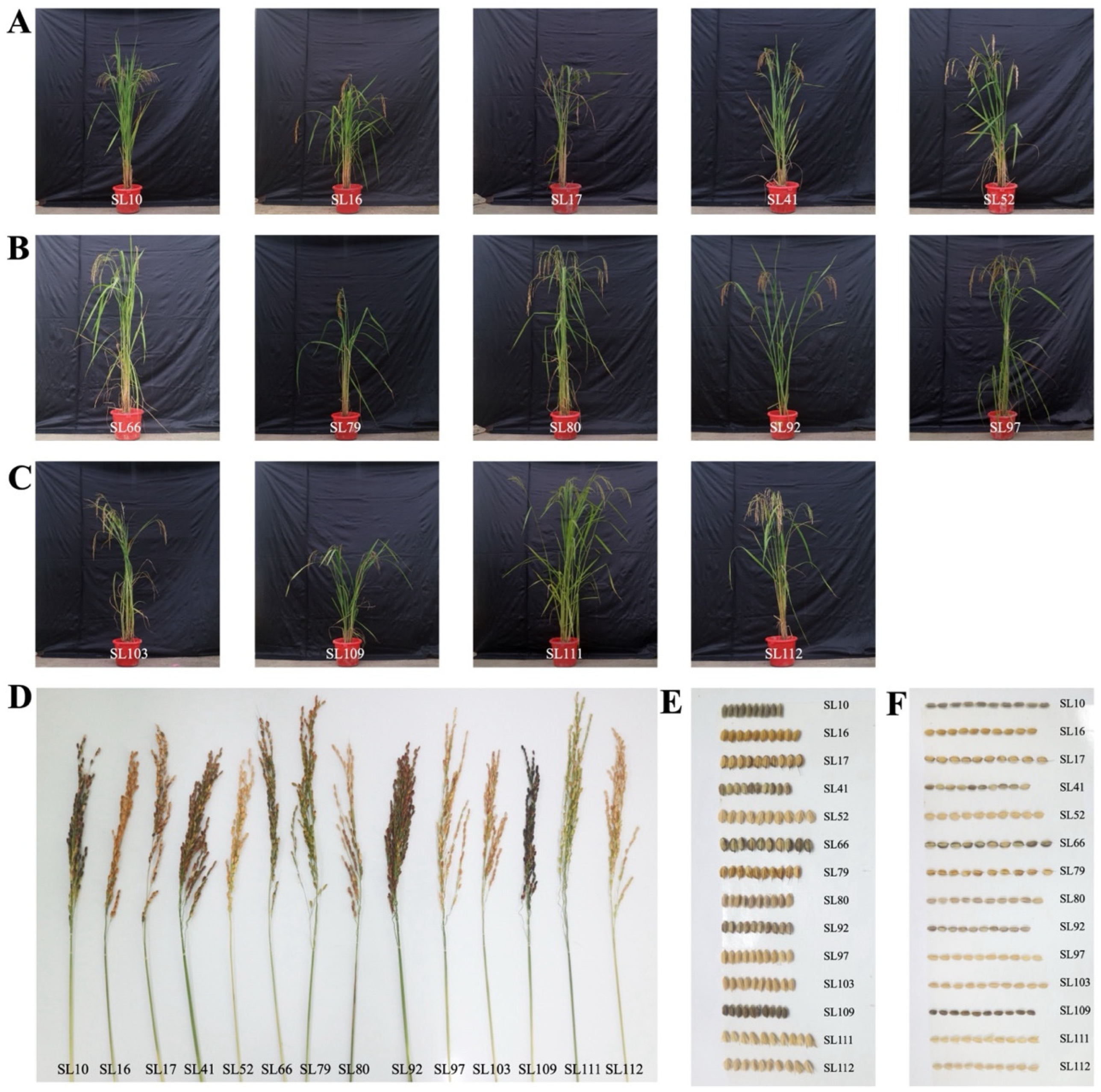 Fourteen representative Shanlan upland rice landraces were observed for plant architecture, panicle type, and grain shape. The observations revealed that the traditional Shanlan upland rice plants were generally tall, although some lines exhibited shorter stature. Significant differences were observed among the different lines in terms of plant architecture and the number of tillers (Figure 1A–C). Representative panicles were selected, showing that landraces such as SL79 and SL111 had relatively longer panicles. The glume color varied, including yellow, black, and brown-red glumes, further highlighting the diversity of Shanlan upland rice landraces (Figure 1D). The grain shape observation exhibited considerable variation. Landraces SL52, SL66, SL111, and SL112 had relatively wider grains, while SL41 and SL92 had the shortest grain lengths. Additionally, seeds from SL52, SL111, and SL112 exhibited lemma, and these morphological differences serve as important reference indicators for variety identification (Figure 1E,F). Additionally, awns were observed in several landraces, and some Shanlan upland rice landraces exhibited stronger shattering traits, suggesting that Shanlan upland rice may have a more ancient genetic relationship with wild rice.