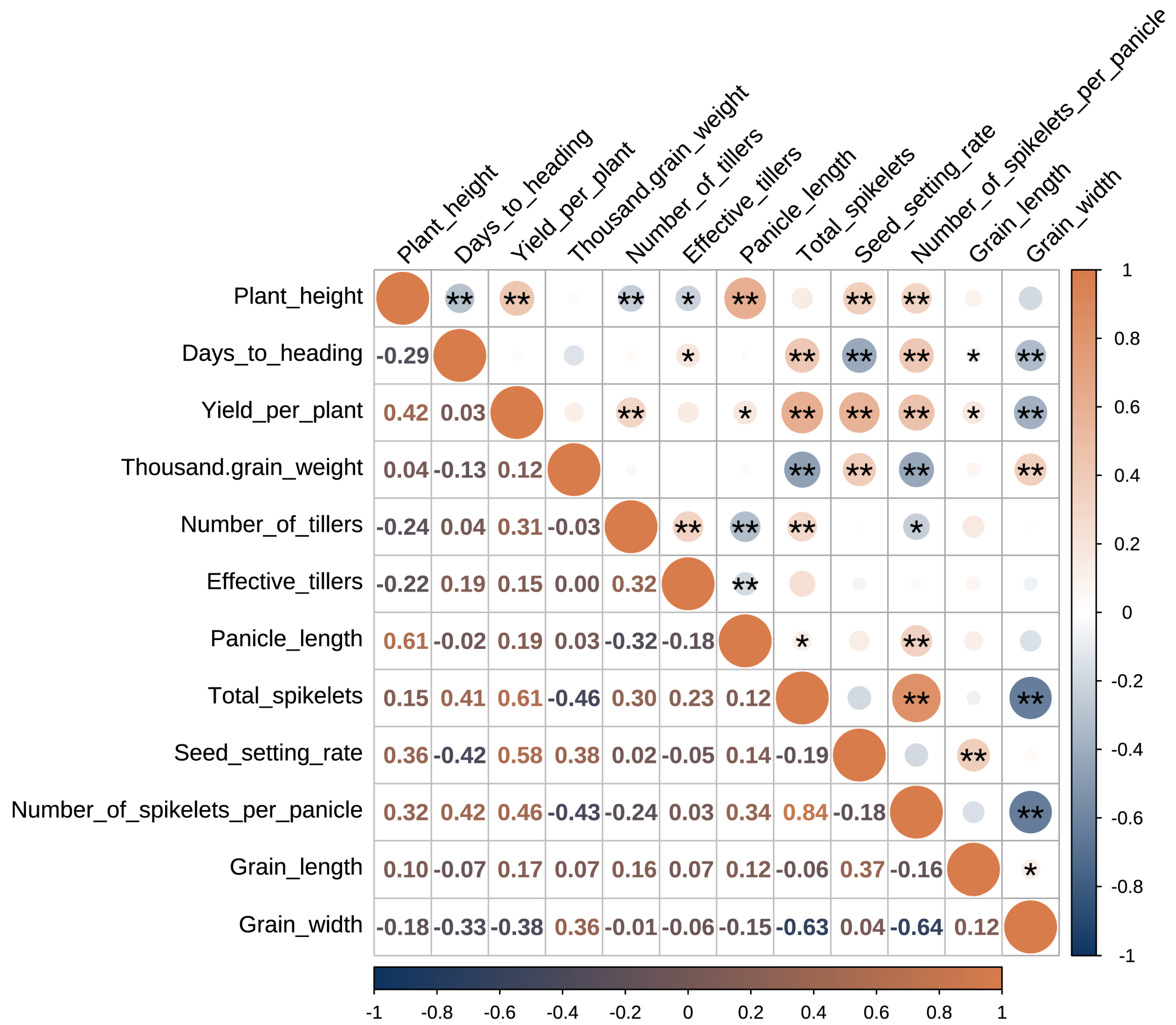 Figure 2. Correlation analysis of major traits in Shanlan upland rice landraces. The matrix displays the correlation coefficients between various agronomic traits. The colors in the matrix represent the strength and direction of the correlation, with blue indicating a negative correlation and orange indicating a positive correlation. The size of the circles corresponds to the magnitude of the correlation, with larger circles representing stronger correlations. Asterisks next to the circles indicate statistical significance: one asterisk (*) for p-values < 0.05 and two asterisks (**) for p-values < 0.01.